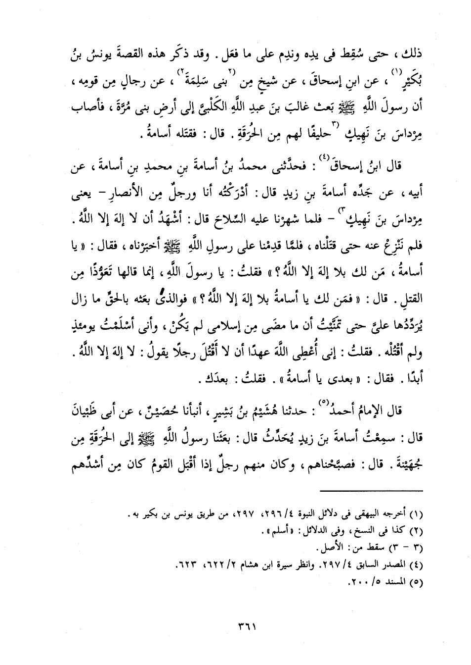 قَالَ ابْنُ إِسْحَاقَ: فَحَدَّثَنِي مُحَمَّدُ بْنُ أُسَامَةَ بْنِ مُحَمَّدِ بْنِ أُسَامَةَ، عَنْ أَبِيهِ، عَنْ جَدِّهِ أُسَامَةَ بْنِ زَيْدٍ قَالَ: «أَدْرَكْتُهُ أَنَا وَرَجُلٌ مِنَ الْأَنْصَارِ - يَعْنِي مِرْدَاسَ بْنَ نَهِيكٍ - فَلَمَّا شَهَرْنَا عَلَيْهِ السِّلَاحَ قَالَ: أَشْهَدُ أَنْ لَا إِلَهَ إِلَّا اللَّهُ. فَلَمْ نَنْزِعْ عَنْهُ حَتَّى قَتَلْنَاهُ، فَلَمَّا قَدِمْنَا عَلَى رَسُولِ اللَّهِ صَلَّى اللَّهُ عَلَيْهِ وَسَلَّمَ أَخْبَرْنَاهُ، فَقَالَ: " يَا أُسَامَةُ، مَنْ لَكَ بِلَا إِلَهَ إِلَّا اللَّهُ؟ " فَقُلْتُ: يَا رَسُولَ اللَّهِ، إِنَّمَا قَالَهَا تَعَوُّذًا مِنَ الْقَتْلِ. قَالَ: " فَمَنْ لَكَ يَا أُسَامَةُ بِلَا إِلَهَ إِلَّا اللَّهُ؟ " فَوَالَّذِي بَعَثَهُ بِالْحَقِّ مَا زَالَ يُرَدِّدُهَا عَلَيَّ حَتَّى تَمَنَّيْتُ أَنَّ مَا مَضَى مِنْ إِسْلَامِي لَمْ يَكُنْ، وَأَنِّي أَسْلَمْتُ يَوْمَئِذٍ وَلَمْ أَقْتُلْهُ. فَقُلْتُ: إِنِّي أُعْطِي اللَّهَ عَهْدًا أَنْ لَا أَقْتُلُ رَجُلًا يَقُولُ لَا إِلَهَ إِلَّا اللَّهُ أَبَدًا. فَقَالَ: " بَعْدِي يَا أُسَامَةُ ". فَقُلْتُ: بَعَدَكَ» .
