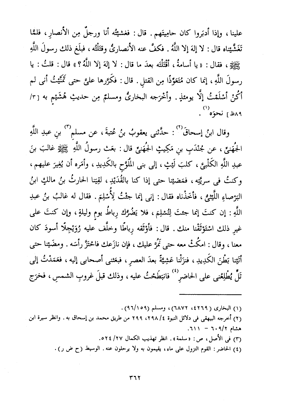وَقَالَ ابْنُ إِسْحَاقَ: حَدَّثَنِي يَعْقُوبُ بْنُ عُتْبَةَ، عَنْ مُسْلِمِ بْنِ عَبْدِ اللَّهِ الْجُهَنِيِّ، عَنْ جُنْدُبِ بْنِ مَكِيثٍ الْجُهَنِيِّ قَالَ: «بَعَثَ رَسُولُ اللَّهِ صَلَّى اللَّهُ عَلَيْهِ وَسَلَّمَ غَالِبَ بْنَ عَبْدِ اللَّهِ الْكَلْبِيَّ، كَلْبَ لَيْثٍ، إِلَى بَنِي الْمُلَوِّحِ بِالْكَدِيدِ، وَأَمَرَهُ أَنْ يُغِيرَ عَلَيْهِمْ،» وَكُنْتُ فِي سَرِيَّتِهِ، فَمَضَيْنَا حَتَّى إِذَا كُنَّا بِالْقَدِيدِ، لَقِينَا الْحَارِثَ بْنَ مَالِكِ بْنِ الْبَرْصَاءِ اللَّيْثِيَّ، فَأَخَذْنَاهُ فَقَالَ: إِنِّي إِنَّمَا جِئْتُ لِأُسْلِمَ. فَقَالَ لَهُ غَالِبُ بْنُ عَبْدِ اللَّهِ: إِنْ كُنْتَ إِنَّمَا جِئْتَ لِتُسْلِمَ، فَلَا يَضُرُّكَ رِبَاطُ يَوْمٍ وَلَيْلَةٍ، وَإِنْ كُنْتَ عَلَى غَيْرِ ذَلِكَ اسْتَوْثَقْنَا مِنْكَ. قَالَ: فَأَوْثَقَهُ رِبَاطًا وَخَلَّفَ عَلَيْهِ رُوَيْجِلًا أَسْوَدَ كَانَ مَعَنَا، وَقَالَ: امْكُثْ مَعَهُ حَتَّى نَمُرَّ عَلَيْكَ، فَإِنْ نَازَعَكَ فَاحْتَزَّ رَأْسَهُ. وَمَضَيْنَا حَتَّى أَتَيْنَا بَطْنَ الْكَدِيدِ، فَنَزَلْنَا عَشِيَّةً بَعْدِ الْعَصْرِ، فَبَعَثَنِي أَصْحَابِي إِلَيْهِ، فَعَمَدْتُ إِلَى تَلٍّ يُطْلِعُنِي عَلَى الْحَاضِرِ فَانْبَطَحْتُ عَلَيْهِ، وَذَلِكَ قَبْلَ غُرُوبِ الشَّمْسِ، فَخَرَجَ