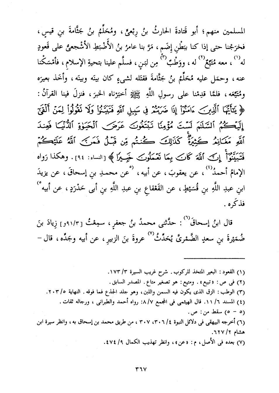 مِنَ الْمُسْلِمِينَ مِنْهُمْ، أَبُو قَتَادَةَ الْحَارِثُ بْنُ رِبْعِيٍّ، وَمُحَلِّمُ بْنُ جَثَّامَةَ بْنِ قَيْسٍ، فَخَرَجْنَا حَتَّى إِذَا كُنَّا بِبَطْنِ إِضَمٍ، مَرَّ بِنَا عَامِرُ بْنُ الْأَضْبَطِ الْأَشْجَعِيُّ عَلَى قَعُودٍ لَهُ، مَعَهُ مُتَيِّعٌ لَهُ، وَوَطْبٌ مِنْ لَبَنٍ، فَسَلَّمَ عَلَيْنَا بِتَحِيَّةِ الْإِسْلَامِ، فَأَمْسَكْنَا عَنْهُ، وَحَمَلَ عَلَيْهِ مُحَلِّمُ بْنُ جَثَّامَةَ فَقَتَلَهُ لِشَيْءٍ كَانَ بَيْنَهُ وَبَيْنَهُ، وَأَخَذَ بِعِيرَهُ وَمُتَيِّعَهُ، فَلَمَّا قَدِمْنَا عَلَى رَسُولِ اللَّهِ صَلَّى اللَّهُ عَلَيْهِ وَسَلَّمَ أَخْبَرْنَاهُ الْخَبَرَ، فَنَزَلَ فِينَا الْقُرْآنُ: {يَا أَيُّهَا الَّذِينَ آمَنُوا إِذَا ضَرَبْتُمْ فِي سَبِيلِ اللَّهِ فَتَبَيَّنُوا وَلَا تَقُولُوا لِمَنْ أَلْقَى إِلَيْكُمُ السَّلَامَ لَسْتَ مُؤْمِنًا تَبْتَغُونَ عَرَضَ الْحَيَاةِ الدُّنْيَا فَعِنْدَ اللَّهِ مَغَانِمُ كَثِيرَةٌ كَذَلِكَ كُنْتُمْ مِنْ قَبْلُ فَمَنَّ اللَّهُ عَلَيْكُمْ فَتَبَيَّنُوا إِنَّ اللَّهَ كَانَ بِمَا تَعْمَلُونَ خَبِيرًا} [النساء: 94] (النِّسَاءِ: 94) وَهَكَذَا رَوَاهُ الْإِمَامُ أَحْمَدُ، عَنْ يَعْقُوبَ، عَنْ أَبِيهِ، عَنْ مُحَمَّدِ بْنِ إِسْحَاقَ، عَنْ يَزِيدَ بْنِ عَبْدِ اللَّهِ بْنِ قُسَيْطٍ، عَنِ الْقَعْقَاعِ بْنِ عَبْدِ اللَّهِ بْنِ أَبِي حَدْرَدٍ، عَنْ أَبِيهِ فَذَكَرَهُ.