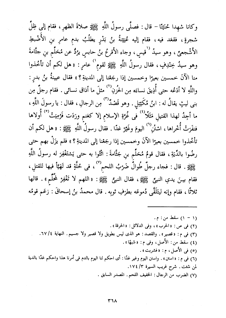 - وَكَانَا شَهِدَا حُنَيْنًا - قَالَ:» فَصَلَّى رَسُولُ اللَّهِ صَلَّى اللَّهُ عَلَيْهِ وَسَلَّمَ صَلَاةَ الظُّهْرِ، فَقَامَ إِلَى ظِلِّ شَجَرَةٍ، فَقَعَدَ فِيهِ، فَقَامَ إِلَيْهِ عُيَيْنَةُ بْنُ بَدْرٍ يَطْلُبُ بِدَمِ عَامِرِ بْنِ الْأَضْبَطِ الْأَشْجَعِيِّ، وَهُوَ سَيِّدُ قَيْسٍ، وَجَاءَ الْأَقْرَعُ بْنُ حَابِسٍ يَرُدُّ عَنْ مُحَلِّمِ بْنِ جَثَّامَةٍ وَهُوَ سَيِّدُ خِنْدِفٍ، فَقَالَ رَسُولُ اللَّهِ صَلَّى اللَّهُ عَلَيْهِ وَسَلَّمَ لِقَوْمِ عَامِرٍ: " هَلْ لَكُمْ أَنْ تَأْخُذُوا مِنَّا الْآنَ خَمْسِينَ بَعِيرًا وَخَمْسِينَ إِذَا رَجَعْنَا إِلَى الْمَدِينَةِ؟ " فَقَالَ عُيَيْنَةُ بْنُ بَدْرٍ وَاللَّهِ لَا أَدَعُهُ حَتَّى أُذِيقَ نِسَاءَهُ مِنَ الْحُزْنِ مِثْلَ مَا أَذَاقَ نِسَائِي. فَقَامَ رَجُلٌ مِنْ بَنِي لَيْثٍ يُقَالُ لَهُ: ابْنُ مُكَيْتِلٍ. وَهُوَ قَصْدٌ مِنَ الرِّجَالِ، فَقَالَ: يَا رَسُولَ اللَّهِ، مَا أَجِدُ لِهَذَا الْقَتِيلِ مَثَلًا فِي غُرَّةِ الْإِسْلَامِ إِلَّا كَغَنَمٍ وَرَدَتْ فَرُمِيَتْ أُولَاهَا فَنَفَرَتْ أُخْرَاهَا، اسْنُنِ الْيَوْمَ وَغَيِّرْ غَدًا. فَقَالَ رَسُولُ اللَّهِ صَلَّى اللَّهُ عَلَيْهِ وَسَلَّمَ: " هَلْ لَكَمَ أَنْ تَأْخُذُوا خَمْسِينَ بَعِيرًا الْآنَ وَخَمْسِينَ إِذَا رَجَعْنَا إِلَى الْمَدِينَةِ؟ " فَلَمْ يَزَلْ بِهِمْ حَتَّى رَضُوا بِالدِّيَةِ، فَقَالَ قَوْمُ مُحَلِّمِ بْنِ جَثَّامَةَ: ائْتُوا بِهِ حَتَّى يَسْتَغْفِرَ لَهُ رَسُولُ اللَّهِ صَلَّى اللَّهُ عَلَيْهِ وَسَلَّمَ. قَالَ: فَجَاءَ رَجُلٌ طُوَالٌ ضَرْبَ اللَّحْمِ، فِي حُلَّةٍ قَدْ تَهَيَّأَ فِيهَا لِلْقَتْلِ، فَقَامَ بَيْنَ يَدَيِ النَّبِيِّ صَلَّى اللَّهُ عَلَيْهِ وَسَلَّمَ، فَقَالَ النَّبِيُّ صَلَّى اللَّهُ عَلَيْهِ وَسَلَّمَ: " اللَّهُمَّ لَا تَغْفِرْ لِمُحَلِّمٍ ". قَالَهَا ثَلَاثًا، فَقَامَ وَإِنَّهُ لَيَتَلَقَّى دُمُوعَهُ بِطَرَفٍ ثَوْبِهِ قَالَ مُحَمَّدُ بْنُ إِسْحَاقَ: زَعَمَ قَوْمُهُ