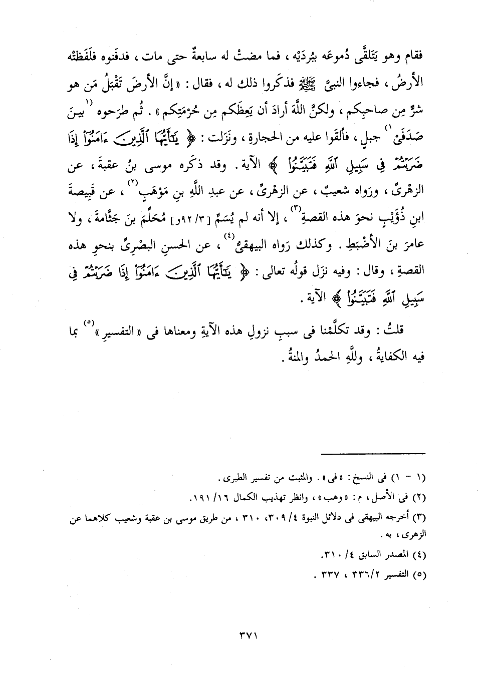 فَقَامَ وَهُوَ يَتَلَقَّى دُمُوعَهُ بِبُرْدَيْهِ، فَمَا مَضَتْ لَهُ سَابِعَةٌ حَتَّى مَاتَ، فَدَفَنُوهُ فَلَفَظَتْهُ الْأَرْضُ، فَجَاءُوا النَّبِيَّ صَلَّى اللَّهُ عَلَيْهِ وَسَلَّمَ فَذَكَرُوا ذَلِكَ لَهُ، فَقَالَ: " إِنَّ الْأَرْضَ تَقْبَلُ مَنْ هُوَ شَرٌّ مِنْ صَاحِبِكُمْ، وَلَكِنَّ اللَّهَ أَرَادَ أَنْ يَعِظَكُمْ مِنْ حُرْمَتِكُمْ ". ثُمَّ طَرَحُوهُ بَيْنَ صَدَفَيْ جَبَلٍ، فَأَلْقَوْا عَلَيْهِ مِنَ الْحِجَارَةِ، وَنَزَلَتْ: {يَا أَيُّهَا الَّذِينَ آمَنُوا إِذَا ضَرَبْتُمْ فِي سَبِيلِ اللَّهِ فَتَبَيَّنُوا} [النساء: 94] الْآيَةَ» وَقَدْ ذَكَرَهُ مُوسَى بْنُ عُقْبَةَ، عَنِ الزُّهْرِيِّ، وَرَوَاهُ شُعَيْبٌ، عَنِ الزُّهْرِيِّ، عَنْ عَبْدِ اللَّهِ بْنِ مَوْهَبٍ، عَنْ قَبِيصَةَ بْنِ ذُؤَيْبٍ نَحْوَ هَذِهِ الْقِصَّةِ، إِلَّا أَنَّهُ لَمْ يُسَمِّ مُحَلِّمَ بْنَ جَثَّامَةَ، وَلَا عَامِرَ بْنَ الْأَضْبَطِ، وَكَذَلِكَ رَوَاهُ الْبَيْهَقِيُّ عَنِ الْحَسَنِ الْبَصْرِيِّ بِنَحْوِ هَذِهِ الْقِصَّةِ، وَقَالَ: وَفِيهِ نَزَلَ قَوْلُهُ تَعَالَى: {يَا أَيُّهَا الَّذِينَ آمَنُوا إِذَا ضَرَبْتُمْ فِي سَبِيلِ اللَّهِ فَتَبَيَّنُوا} [النساء: 94] الْآيَةَ.