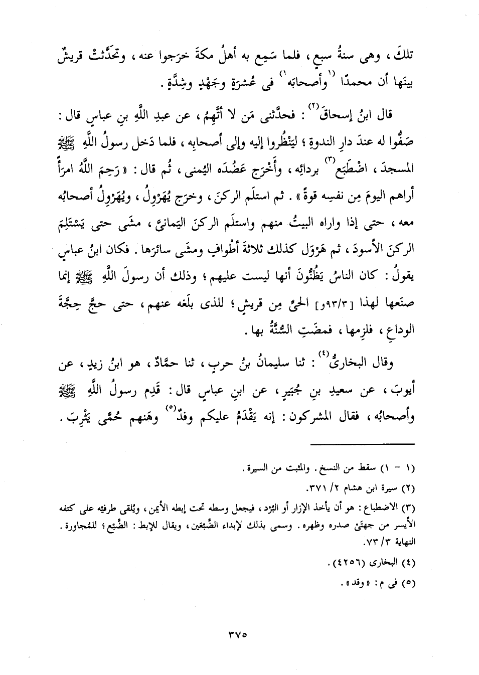 قَالَ ابْنُ إِسْحَاقَ: فَحَدَّثَنِي مَنْ لَا أَتَّهِمُ، عَنْ عَبْدِ اللَّهِ بْنِ عَبَّاسٍ قَالَ: «صَفُّوا لَهُ عِنْدَ دَارِ النَّدْوَةِ، لِيَنْظُرُوا إِلَيْهِ وَإِلَى أَصْحَابِهِ، فَلَمَّا دَخَلَ رَسُولُ اللَّهِ صَلَّى اللَّهُ عَلَيْهِ وَسَلَّمَ الْمَسْجِدَ، اضْطَبَعَ بِرِدَائِهِ، وَأَخْرَجَ عَضُدَهُ الْيُمْنَى، ثُمَّ قَالَ: " رَحِمَ اللَّهُ امَرَأً أَرَاهُمُ الْيَوْمَ مِنْ نَفْسِهِ قُوَّةً ". ثُمَّ اسْتَلَمَ الرُّكْنَ، وَخَرَجَ يُهَرْوِلُ، وَيُهَرْوِلُ أَصْحَابُهُ مَعَهُ، حَتَّى إِذَا وَارَاهُ الْبَيْتُ مِنْهُمْ وَاسْتَلَمَ الرُّكْنَ الْيَمَانِيَّ، مَشَى حَتَّى يَسْتَلِمَ الرُّكْنَ الْأَسْوَدَ، ثُمَّ هَرْوَلَ كَذَلِكَ ثَلَاثَةَ أَطْوَافٍ وَمَشَى سَائِرَهَا» فَكَانَ ابْنُ عَبَّاسٍ يَقُولُ: كَانَ النَّاسُ يَظُنُّونَ أَنَّهَا لَيْسَتْ عَلَيْهِمْ، وَذَلِكَ أَنَّ رَسُولَ اللَّهِ صَلَّى اللَّهُ عَلَيْهِ وَسَلَّمَ إِنَّمَا صَنَعَهَا لِهَذَا الْحَيِّ مِنْ قُرَيْشٍ، لِلَّذِي بَلَغَهُ عَنْهُمْ، حَتَّى حَجَّ حِجَّةَ الْوَدَاعِ، فَلَزِمَهَا، فَمَضَتِ السُّنَّةُ بِهَا.