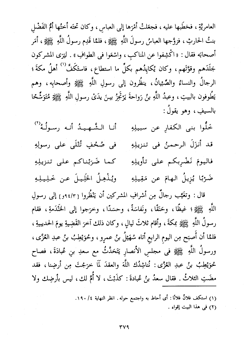 الْعَامِرِيَّةِ، فَخَطَبَهَا عَلَيْهِ، فَجَعَلَتْ أَمْرَهَا إِلَى الْعَبَّاسِ، وَكَانَ تَحْتَهُ أُخْتُهَا أُمُّ الْفَضْلِ بِنْتُ الْحَارِثِ، فَزَوَّجَهَا الْعَبَّاسُ رَسُولَ اللَّهِ صَلَّى اللَّهُ عَلَيْهِ وَسَلَّمَ، فَلَمَّا قَدِمَ رَسُولُ اللَّهِ صَلَّى اللَّهُ عَلَيْهِ وَسَلَّمَ، أَمَرَ أَصْحَابَهُ فَقَالَ: " اكْشِفُوا عَنِ الْمَنَاكِبِ، وَاسْعَوْا فِي الطَّوَافِ ". لِيَرَى الْمُشْرِكُونَ جَلَدَهُمْ وَقُوَّتَهُمْ، وَكَانَ يُكَايِدُهُمْ بِكُلِّ مَا اسْتَطَاعَ، فَاسْتَكَفَّ أَهْلُ مَكَّةَ، الرِّجَالُ وَالنِّسَاءُ وَالصِّبْيَانُ، يَنْظُرُونَ إِلَى رَسُولِ اللَّهِ صَلَّى اللَّهُ عَلَيْهِ وَسَلَّمَ وَأَصْحَابِهِ، وَهُمْ يَطُوفُونَ بِالْبَيْتِ، وَعَبْدُ اللَّهِ بْنُ رَوَاحَةَ يَرْتَجِزُ بَيْنَ يَدَيْ رَسُولِ اللَّهِ صَلَّى اللَّهُ عَلَيْهِ وَسَلَّمَ مُتَوَشِّحًا بِالسَّيْفِ وَهُوَ يَقُولُ:
