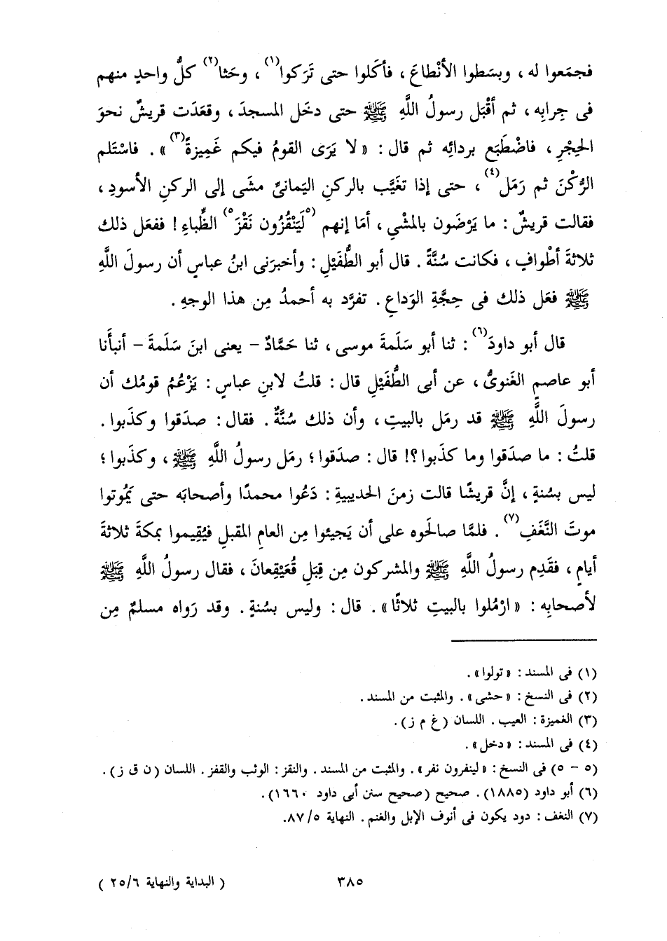 فَجَمَعُوا لَهُ، وَبَسَطُوا الْأَنْطَاعَ، فَأَكَلُوا حَتَّى تَرَكُوا، وَحَثَا كُلُّ وَاحِدٍ مِنْهُمْ فِي جِرَابِهِ، ثُمَّ أَقْبَلَ رَسُولُ اللَّهِ صَلَّى اللَّهُ عَلَيْهِ وَسَلَّمَ حَتَّى دَخَلَ الْمَسْجِدَ، وَقَعَدَتْ قُرَيْشٌ نَحْوَ الْحِجْرِ، فَاضْطَبَعَ بِرِدَائِهِ ثُمَّ قَالَ: " لَا يَرَى الْقَوْمُ فِيكُمْ غَمِيزَةً ". فَاسْتَلَمَ الرُّكْنَ ثُمَّ رَمَلَ، حَتَّى إِذَا تَغَيَّبَ بِالرُّكْنِ الْيَمَانِيِّ مَشَى إِلَى الرُّكْنِ الْأَسْوَدِ فَقَالَتْ قُرَيْشٌ: مَا يَرْضَوْنَ بِالْمَشْيِ، أَمَا إِنَّهُمْ لَيَنْقُزُونَ نَقْزَ الظِّبَاءِ! فَفَعَلَ ذَلِكَ ثَلَاثَةَ أَطْوَافٍ، فَكَانَتْ سُنَّةً» قَالَ أَبُو الطُّفَيْلِ: وَأَخْبَرَنِي ابْنُ عَبَّاسٍ أَنَّ رَسُولَ اللَّهِ صَلَّى اللَّهُ عَلَيْهِ وَسَلَّمَ فَعَلَ ذَلِكَ فِي حِجَّةِ الْوَدَاعِ. تَفَرَّدَ بِهِ أَحْمَدُ مِنْ هَذَا الْوَجْهِ.