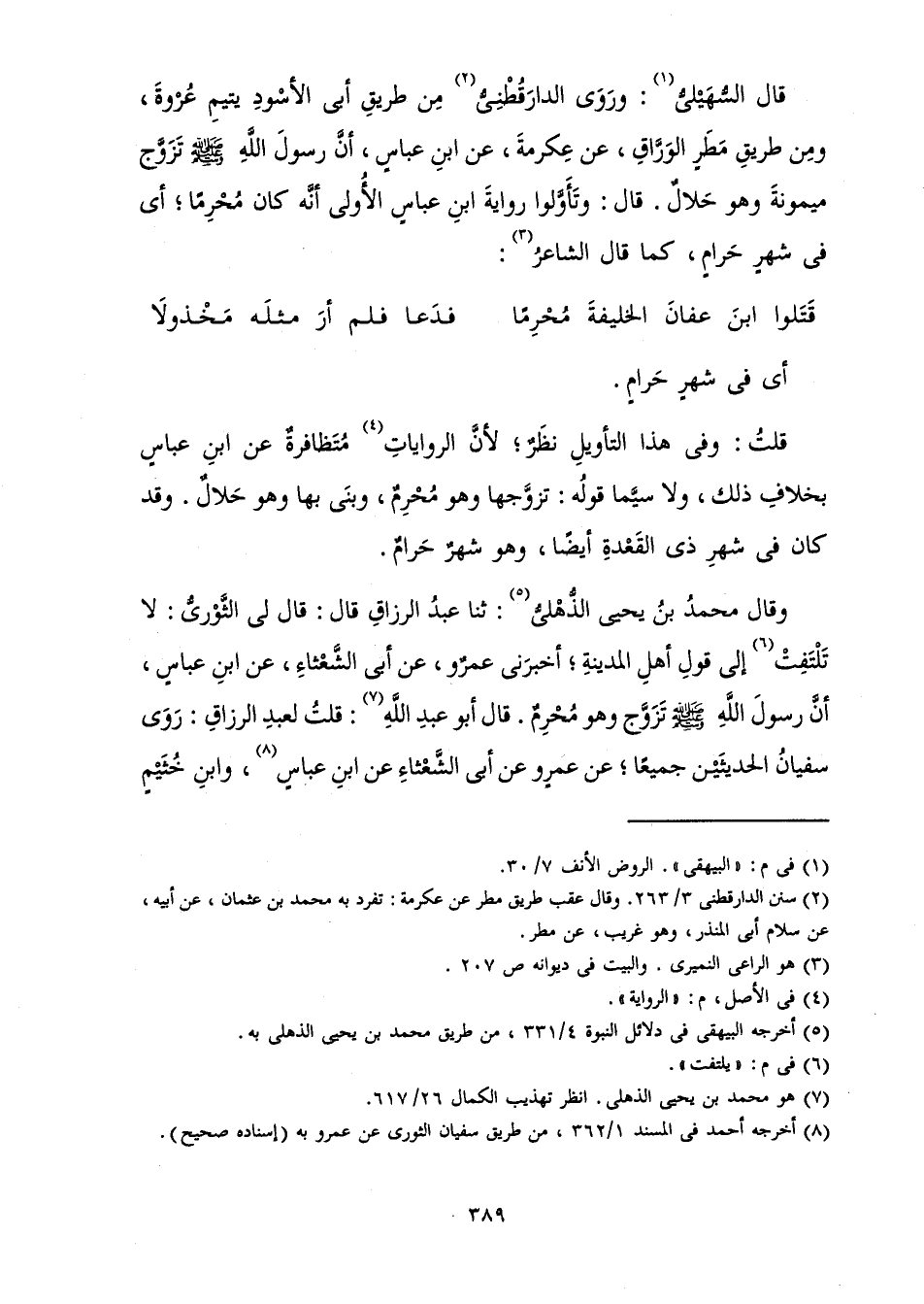 قَالَ السُّهَيْلِيُّ: وَرَوَى الدَّارَقُطْنِيُّ مِنْ طَرِيقِ أَبِي الْأَسْوَدِ يَتِيمِ عُرْوَةَ، وَمِنْ طَرِيقِ مَطَرٍ الْوَرَّاقِ، عَنْ عِكْرِمَةَ، عَنِ ابْنِ عَبَّاسٍ «أَنَّ رَسُولَ اللَّهِ صَلَّى اللَّهُ عَلَيْهِ وَسَلَّمَ تَزَوَّجَ مَيْمُونَةَ وَهُوَ حَلَالٌ،» قَالَ: وَتَأَوَّلُوا رِوَايَةَ ابْنِ عَبَّاسٍ الْأُولَى أَنَّهُ كَانَ مُحْرِمًا، أَيْ فِي شَهْرٍ حَرَامٍ، كَمَا قَالَ الشَّاعِرُ: