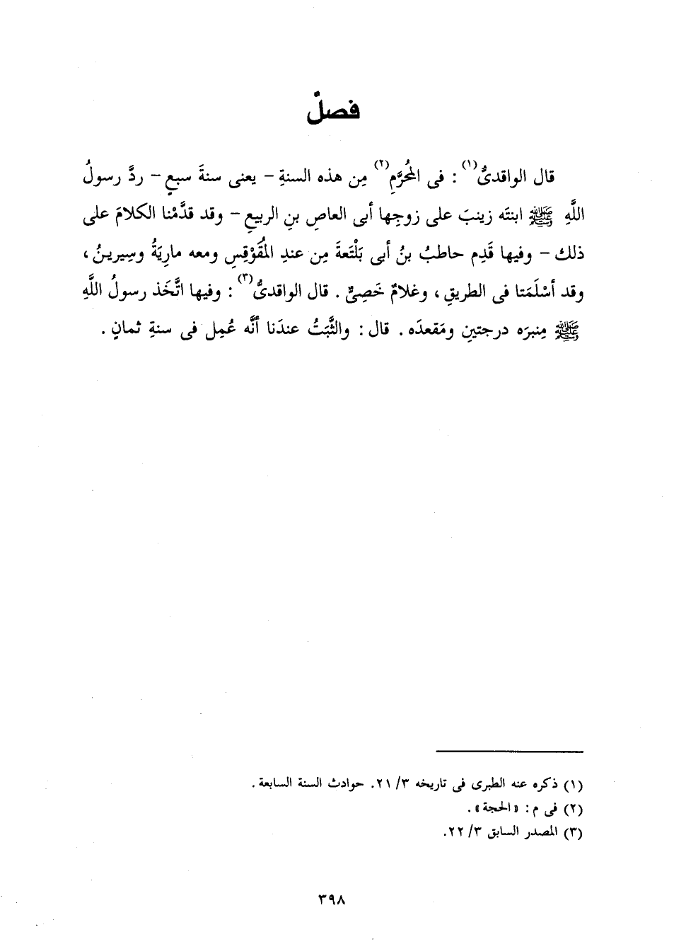 قَالَ الْوَاقِدِيُّ: فِي الْمُحَرَّمِ مِنْ هَذِهِ السَّنَةِ - يَعْنِي سَنَةَ سَبْعٍ - رَدَّ رَسُولُ اللَّهِ صَلَّى اللَّهُ عَلَيْهِ وَسَلَّمَ ابْنَتَهُ زَيْنَبَ عَلَى زَوْجِهَا أَبِي الْعَاصِ بْنِ الرَّبِيعِ - وَقَدْ قَدَّمْنَا الْكَلَامَ عَلَى ذَلِكَ - وَفِيهَا قَدِمَ حَاطِبُ بْنُ أَبِي بَلْتَعَةَ مِنْ عِنْدِ الْمُقَوْقِسِ وَمَعَهُ مَارِيَةُ وَسِيرِينُ، وَقَدْ أَسْلَمَتَا فِي الطَّرِيقِ، وَغُلَامٌ خَصِيٌّ. قَالَ الْوَاقِدِيُّ: «وَفِيهَا اتَّخَذَ رَسُولُ اللَّهِ صَلَّى اللَّهُ عَلَيْهِ وَسَلَّمَ مِنْبَرَهُ دَرَجَتَيْنِ وَمَقْعَدَهُ. قَالَ: وَالثَّبَتُ عِنْدَنَا أَنَّهُ عُمِلَ فِي سَنَةِ ثَمَانٍ» .