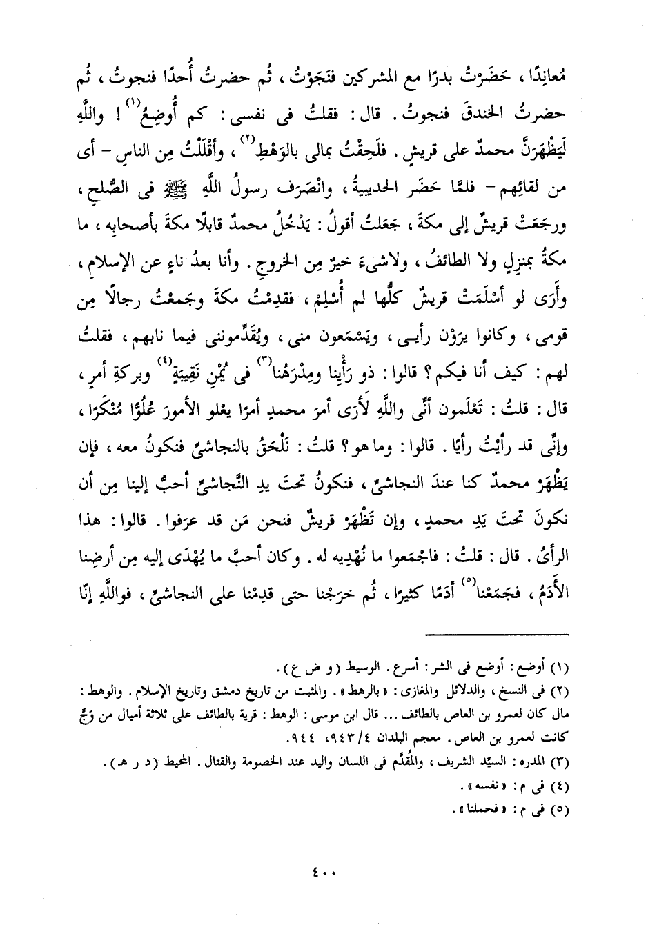 مُعَانِدًا حَضَرْتُ بَدْرًا مَعَ الْمُشْرِكِينَ فَنَجَوْتُ، ثُمَّ حَضَرْتُ أُحُدًا فَنَجَوْتُ، ثُمَّ حَضَرْتُ الْخَنْدَقَ فَنَجَوْتُ، قَالَ: فَقُلْتُ فِي نَفْسِي: كَمْ أُوضِعُ! وَاللَّهِ لَيَظْهَرَنَّ مُحَمَّدٌ عَلَى قُرَيْشٍ. فَلَحِقْتُ بِمَالِي بِالْوَهْطِ، وَأَقْلَلْتُ مِنَ النَّاسِ - أَيْ مِنْ لِقَائِهِمْ - فَلَمَّا حَضَرَ الْحُدَيْبِيَةُ، وَانْصَرَفَ رَسُولُ اللَّهِ صَلَّى اللَّهُ عَلَيْهِ وَسَلَّمَ فِي الصُّلْحِ، وَرَجَعَتْ قُرَيْشٌ إِلَى مَكَّةَ، جَعَلْتُ أَقُولُ: يَدْخُلُ مُحَمَّدٌ قَابِلًا مَكَّةَ بِأَصْحَابِهِ، مَا مَكَّةُ بِمَنْزِلٍ وَلَا الطَّائِفُ، وَلَا شَيْءَ خَيْرٌ مِنَ الْخُرُوجِ. وَأَنَا بَعْدُ نَاءٍ عَنِ الْإِسْلَامِ، وَأَرَى لَوْ أَسْلَمَتْ قُرَيْشٌ كُلُّهَا لَمْ أُسْلِمْ، فَقَدِمْتُ مَكَّةَ وَجَمَعْتُ رِجَالًا مِنْ قَوْمِي، وَكَانُوا يَرَوْنَ رَأْيِي، وَيَسْمَعُونَ مِنِّي، وَيُقَدِّمُونَنِي فِيمَا نَابَهُمْ، فَقُلْتُ لَهُمْ: كَيْفَ أَنَا فِيكُمْ؟ قَالُوا: ذُو رَأْيِنَا وَمِدْرَهُنَا فِي يُمْنِ نَقِيبَةٍ وَبَرَكَةِ أَمْرٍ، قَالَ: قُلْتُ: تَعْلَمُونَ أَنِّي وَاللَّهِ لَأَرَى أَمْرَ مُحَمَّدٍ أَمْرًا يَعْلُو الْأُمُورَ عُلُوًّا مُنْكَرًا، وَإِنِّي قَدْ رَأَيْتُ رَأْيًا. قَالُوا: وَمَا هُوَ؟ قُلْتُ: نَلْحَقُ بِالنَّجَاشِيِّ فَنَكُونُ مَعَهُ، فَإِنْ يَظْهَرْ مُحَمَّدٌ كُنَّا عِنْدَ النَّجَاشِيِّ، فَنَكُونُ تَحْتَ يَدِ النَّجَاشِيِّ أَحَبُّ إِلَيْنَا مِنْ أَنْ نَكُونَ تَحْتَ يَدِ مُحَمَّدٍ، وَإِنْ تَظْهَرْ قُرَيْشٌ فَنَحْنُ مَنْ قَدْ عَرَفُوا، قَالُوا: هَذَا الرَّأْيُ. قَالَ: قُلْتُ: فَاجْمَعُوا مَا نَهْدِيهِ لَهُ. وَكَانَ أَحَبَّ مَا يُهْدَى إِلَيْهِ مِنْ أَرْضِنَا الْأَدَمُ، فَجَمَعْنَا أَدَمًا كَثِيرًا، ثُمَّ خَرَجْنَا حَتَّى قَدِمْنَا عَلَى النَّجَاشِيِّ، فَوَاللَّهِ إِنَّا