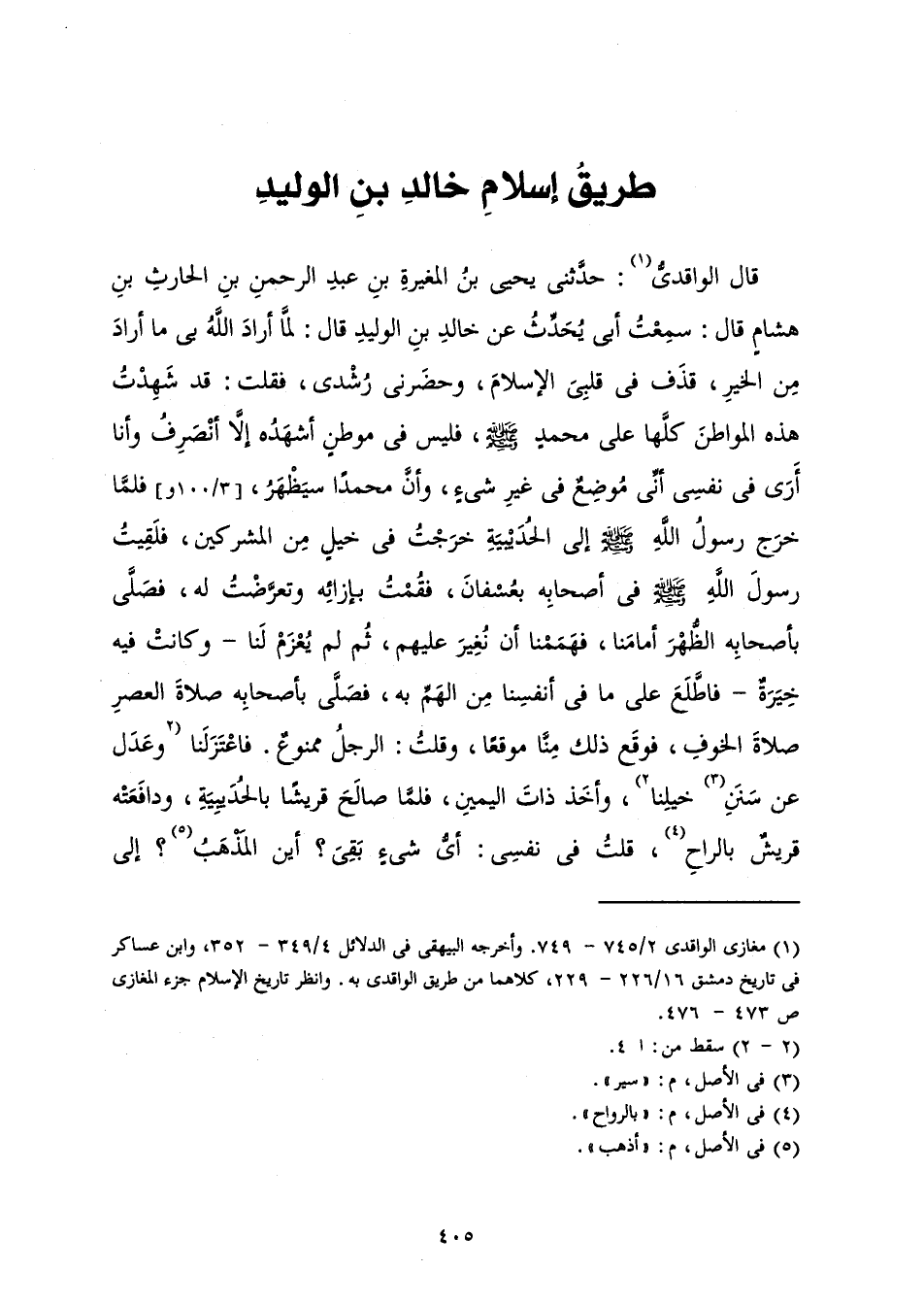 قَالَ الْوَاقِدِيُّ: حَدَّثَنِي يَحْيَى بْنُ الْمُغِيرَةِ بْنِ عَبْدِ الرَّحْمَنِ بْنِ الْحَارِثِ بْنِ هِشَامٍ قَالَ: سَمِعْتُ أَبِي يُحَدِّثُ عَنْ خَالِدِ بْنِ الْوَلِيدِ قَالَ: لَمَّا أَرَادَ اللَّهُ بِي مَا أَرَادَ مِنَ الْخَيْرِ، قَذَفَ فِي قَلْبِي الْإِسْلَامَ، وَحَضَرَنِي رُشْدِي، فَقُلْتُ: قَدْ شَهِدْتُ هَذِهِ الْمَوَاطِنَ كُلَّهَا عَلَى مُحَمَّدٍ صَلَّى اللَّهُ عَلَيْهِ وَسَلَّمَ، فَلَيْسَ فِي مَوْطِنٍ أَشْهَدُهُ إِلَّا أَنْصَرِفُ وَأَنَا أَرَى فِي نَفْسِي أَنِّي مَوْضِعٌ فِي غَيْرِ شَيْءٍ، وَأَنَّ مُحَمَّدًا سَيَظْهَرُ، فَلَمَّا خَرَجَ رَسُولُ اللَّهِ صَلَّى اللَّهُ عَلَيْهِ وَسَلَّمَ إِلَى الْحُدَيْبِيَةِ خَرَجْتُ فِي خَيْلٍ مِنَ الْمُشْرِكِينَ، فَلَقِيتُ رَسُولَ اللَّهِ صَلَّى اللَّهُ عَلَيْهِ وَسَلَّمَ فِي أَصْحَابِهِ بَعُسْفَانَ، فَقُمْتُ بِإِزَائِهِ وَتَعَرَّضْتُ لَهُ، فَصَلَّى بِأَصْحَابِهِ الظُّهْرَ أَمَامَنَا، فَهَمَمْنَا أَنْ نُغِيرَ عَلَيْهِمْ، ثُمَّ لَمْ يُعْزَمْ لَنَا - وَكَانَتْ فِيهِ خِيَرَةٌ - فَاطَّلَعَ عَلَى مَا فِي أَنْفُسِنَا مِنَ الْهَمِّ بِهِ، فَصَلَّى بِأَصْحَابِهِ صَلَاةَ الْعَصْرِ صَلَاةَ الْخَوْفِ، فَوَقْعَ ذَلِكَ مِنَّا مَوْقِعًا، وَقُلْتُ: الرَّجُلُ مَمْنُوعٌ فَاعْتَزَلَنَا وَعَدَلَ عَنْ سَنَنِ خَيْلِنَا، وَأَخَذَ ذَاتَ الْيَمِينِ، فَلَمَّا صَالَحَ قُرَيْشًا بِالْحُدَيْبِيَةَ، وَدَافَعَتْهُ قُرَيْشٌ بِالرَّاحِ، قَلْتُ فِي نَفْسِي: أَيُّ شَيْءٍ بَقِيَ؟ أَيْنَ الْمَذْهَبُ؟ إِلَى