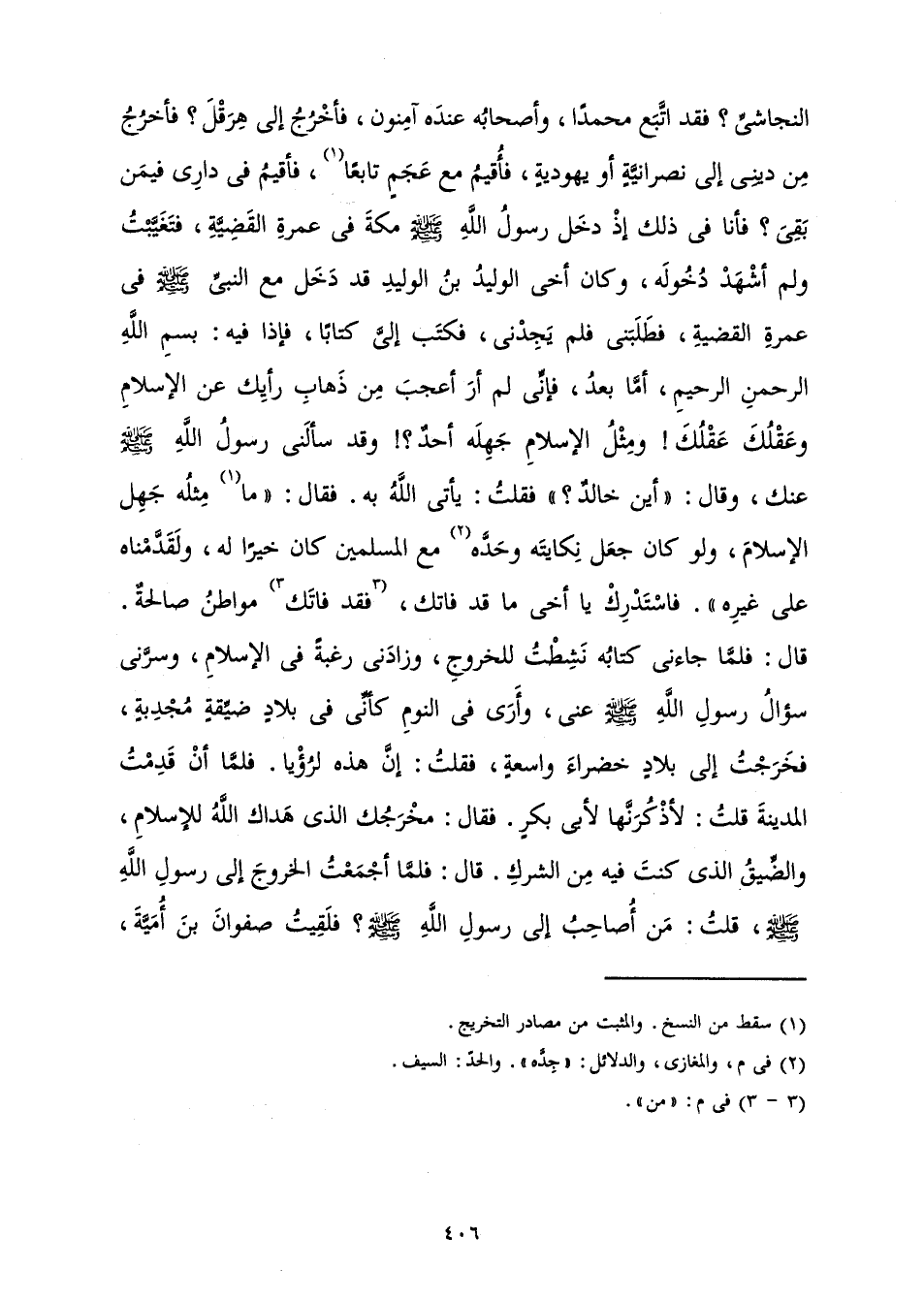 النَّجَاشِيِّ؟ فَقَدِ اتَّبَعَ مُحَمَّدًا، وَأَصْحَابُهُ عِنْدَهُ آمِنُونَ، فَأَخْرُجُ إِلَى هِرَقْلَ؟ فَأَخْرُجُ مِنْ دِينِي إِلَى نَصْرَانِيَّةٍ أَوْ يَهُودِيَّةٍ، فَأُقِيمُ فِي عَجَمٍ تَابِعًا، فَأُقِيمُ فِي دَارِي فِيمَنْ بَقِيَ؟ فَأَنَا فِي ذَلِكَ إِذْ دَخَلَ رَسُولُ اللَّهِ صَلَّى اللَّهُ عَلَيْهِ وَسَلَّمَ مَكَّةَ فِي عُمْرَةِ الْقَضِيَّةِ، فَتَغَيَّبْتُ وَلَمْ أَشْهَدْ دُخُولَهُ، وَكَانَ أَخِي الْوَلِيدُ بْنُ الْوَلِيدِ قَدْ دَخَلَ مَعَ النَّبِيِّ صَلَّى اللَّهُ عَلَيْهِ وَسَلَّمَ فِي عُمْرَةِ الْقَضِيَّةِ، فَطَلَبَنِي فَلَمْ يَجِدْنِي، فَكَتَبَ إِلَيَّ كِتَابًا، فَإِذَا فِيهِ: بِسْمِ اللَّهِ الرَّحْمَنِ الرَّحِيمِ، أَمَّا بَعْدُ، فَإِنِّي لَمْ أَرَ أَعْجَبَ مِنْ ذَهَابِ رَأْيِكَ عَنِ الْإِسْلَامِ وَعَقْلُكَ عَقْلُكَ! وَمِثْلُ الْإِسْلَامِ جَهِلَهُ أَحَدٌ؟! وَقَدْ سَأَلَنِي رَسُولُ اللَّهِ صَلَّى اللَّهُ عَلَيْهِ وَسَلَّمَ عَنْكَ، وَقَالَ: " أَيْنَ خَالِدٌ؟ " فَقُلْتُ: يَأْتِي اللَّهُ بِهِ. فَقَالَ: " مَا مِثْلُهُ جَهِلَ الْإِسْلَامَ، وَلَوْ كَانَ جَعَلَ نِكَايَتَهُ وَحَدَّهُ مَعَ الْمُسْلِمِينَ كَانَ خَيْرًا لَهُ، وَلَقَدَّمْنَاهُ عَلَى غَيْرِهِ ". فَاسْتَدْرِكْ يَا أَخِي مَا قَدْ فَاتَكَ، فَقَدْ فَاتَكَ مَوَاطِنُ صَالِحَةٌ. قَالَ: فَلَمَّا جَاءَنِي كِتَابُهُ نَشِطْتُ لِلْخُرُوجِ، وَزَادَنِي رَغْبَةً فِي الْإِسْلَامِ، وَسَرَّنِي سُؤَالُ رَسُولِ اللَّهِ صَلَّى اللَّهُ عَلَيْهِ وَسَلَّمَ عَنِّي، وَأَرَى فِي النَّوْمِ كَأَنِّي فِي بِلَادٍ ضَيِّقَةٍ مُجْدِبَةٍ، فَخَرَجْتُ إِلَى بِلَادٍ خَضْرَاءَ وَاسِعَةٍ، فَقُلْتُ: إِنَّ هَذِهِ لَرُؤْيَا فَلَمَّا أَنْ قَدِمْتُ الْمَدِينَةَ قُلْتُ: لَأَذْكُرَنَّهَا لِأَبِي بَكْرٍ. فَقَالَ: مَخْرَجُكَ الذى هَدَاكَ اللَّهُ لِلْإِسْلَامِ، وَالضِّيقُ الَّذِي كُنْتَ فِيهِ مِنَ الشِّرْكِ. قَالَ: فَلَمَّا أَجْمَعْتُ الْخُرُوجَ إِلَى رَسُولِ اللَّهِ صَلَّى اللَّهُ عَلَيْهِ وَسَلَّمَ قُلْتُ: مَنْ أُصَاحِبُ إِلَى رَسُولِ اللَّهِ صَلَّى اللَّهُ عَلَيْهِ وَسَلَّمَ؟ فَلَقِيتُ صَفْوَانَ بْنَ أُمَيَّةَ،