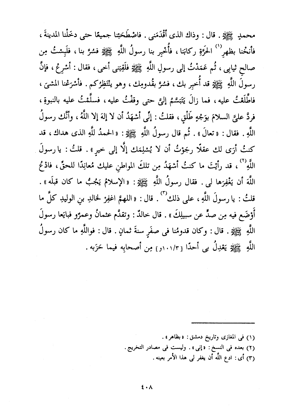 مُحَمَّدٍ صَلَّى اللَّهُ عَلَيْهِ وَسَلَّمَ. قَالَ: وَذَاكَ الَّذِي أَقْدَمَنِي. فَاصْطَحَبْنَا جَمِيعًا حَتَّى دَخَلْنَا الْمَدِينَةَ، فَأَنَخْنَا بِظَهْرِ الْحَرَّةِ رِكَابَنَا، فَأُخْبِرَ بِنَا رَسُولُ اللَّهِ صَلَّى اللَّهُ عَلَيْهِ وَسَلَّمَ فَسُرَّ بِنَا، فَلَبِسْتُ مِنْ صَالِحِ ثِيَابِي، ثُمَّ عَمَدْتُ إِلَى رَسُولِ اللَّهِ صَلَّى اللَّهُ عَلَيْهِ وَسَلَّمَ فَلَقِيَنِي أَخِي، فَقَالَ: أَسْرِعْ، فَإِنَّ رَسُولَ اللَّهِ صَلَّى اللَّهُ عَلَيْهِ وَسَلَّمَ قَدْ أُخْبِرَ بِكَ، فَسُرَّ بِقُدُومِكَ، وَهُوَ يَنْتَظِرُكُمْ. فَأَسْرَعْنَا الْمَشْيَ، فَاطَّلَعْتُ عَلَيْهِ، فَمَا زَالَ يَتَبَسَّمُ إِلَيَّ حَتَّى وَقَفْتُ عَلَيْهِ، فَسَلَّمْتُ عَلَيْهِ بِالنُّبُوَّةِ، فَرَدَّ عَلَيَّ السَّلَامَ بِوَجْهٍ طَلْقٍ، فَقُلْتُ: إِنِّي أَشْهَدُ أَنْ لَا إِلَهَ إِلَّا اللَّهُ، وَأَنَّكَ رَسُولُ اللَّهِ. فَقَالَ: " تَعَالَ ". ثُمَّ قَالَ رَسُولُ اللَّهِ صَلَّى اللَّهُ عَلَيْهِ وَسَلَّمَ: " «الْحَمْدُ لِلَّهِ الَّذِي هَدَاكَ، قَدْ كُنْتُ أَرَى لَكَ عَقْلًا رَجَوْتُ أَنْ لَا يُسْلِمَكَ إِلَّا إِلَى خَيْرٍ» ". قُلْتُ: يَا رَسُولَ اللَّهِ، قَدْ رَأَيْتَ مَا كُنْتُ أَشْهَدُ مِنْ تِلْكَ الْمَوَاطِنِ عَلَيْكَ مُعَانِدًا لِلْحَقِّ، فَادْعُ اللَّهَ أَنْ يَغْفِرَهَا لِي فَقَالَ رَسُولُ اللَّهِ صَلَّى اللَّهُ عَلَيْهِ وَسَلَّمَ: " «الْإِسْلَامُ يَجُبُّ مَا كَانَ قَبْلَهُ» ". قُلْتُ: يَا رَسُولَ اللَّهِ، عَلَى ذَلِكَ. قَالَ: " «اللَّهُمَّ اغْفِرْ لِخَالِدِ بْنِ الْوَلِيدِ كُلَّ مَا أَوْضَعَ فِيهِ مِنْ صَدٍّ عَنْ سَبِيلِكَ» ". قَالَ خَالِدٌ: وَتَقَدَّمَ عُثْمَانُ وَعَمْرٌو فَبَايَعَا رَسُولَ اللَّهِ صَلَّى اللَّهُ عَلَيْهِ وَسَلَّمَ. قَالَ: وَكَانَ قُدُومُنَا فِي صَفَرٍ سَنَةَ ثَمَانٍ. قَالَ: فَوَاللَّهِ مَا كَانَ رَسُولُ اللَّهِ صَلَّى اللَّهُ عَلَيْهِ وَسَلَّمَ يَعْدِلُ بِي أَحَدًا مِنْ أَصْحَابِهِ فِيمَا حَزَبَهُ.