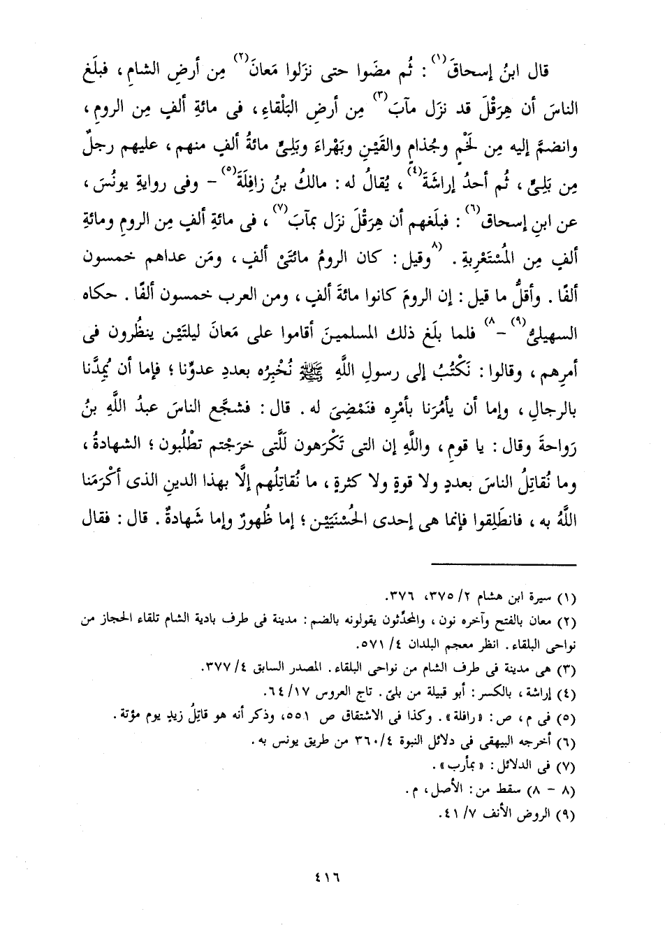 قَالَ ابْنُ إِسْحَاقَ: ثُمَّ مَضَوْا حَتَّى نَزَلُوا مَعَانٍ مِنْ أَرْضِ الشَّامِ، فَبَلَغَ النَّاسَ أَنَّ هِرَقْلَ قَدْ نَزَلَ مَآبَ مِنْ أَرْضِ الْبَلْقَاءِ، فِي مِائَةِ أَلْفٍ مِنَ الرُّومِ، وَانْضَمَّ إِلَيْهِ مِنْ لَخْمٍ وَجُذَامٍ وَالْقَيْنِ وَبَهْرَاءَ وَبَلِيٍّ مِائَةُ أَلْفٍ مِنْهُمْ، عَلَيْهِمْ رَجُلٌ مِنَ بَلِيٍّ، ثُمَّ أَحَدُ إِرَاشَةَ، يُقَالُ لَهُ: مَالِكُ بْنُ زَافِلَةَ - وَفِي رِوَايَةِ يُونُسَ، عَنِ ابْنِ إِسْحَاقَ: فَبَلَغَهُمْ أَنَّ هِرَقْلَ نَزَلَ بِمَآبَ، فِي مِائَةِ أَلْفٍ مِنَ الرُّومِ وَمِائَةِ أَلْفٍ مِنَ الْمُسْتَعْرِبَةِ. وَقِيلَ: كَانَ الرُّومُ مِائَتَيْ أَلْفٍ، وَمَنْ عَدَاهُمْ خَمْسُونَ أَلْفًا. وَأَقَلُّ مَا قِيلَ: إِنَّ الرُّومَ كَانُوا مِائَةَ أَلْفٍ، وَمِنَ الْعَرَبِ خَمْسُونَ أَلْفًا. حَكَاهُ السُّهَيْلِيُّ - فَلَمَّا بَلَغَ ذَلِكَ الْمُسْلِمِينَ أَقَامُوا عَلَى مَعَانٍ لَيْلَتَيْنِ يَنْظُرُونَ فِي أَمْرِهِمْ، وَقَالُوا: نَكْتُبُ إِلَى رَسُولِ اللَّهِ صَلَّى اللَّهُ عَلَيْهِ وَسَلَّمَ نُخْبِرُهُ بِعَدَدِ عَدُّونَا، فَإِمَّا أَنْ يَمُدَّنَا بِالرِّجَالِ، وَإِمَّا أَنْ يَأْمُرَنَا بِأَمْرِهِ فَنَمْضِيَ لَهُ. قَالَ: فَشَجَّعَ النَّاسَ عَبْدُ اللَّهِ بْنُ رَوَاحَةَ وَقَالَ: يَا قَوْمِ، وَاللَّهِ إِنَّ الَّتِي تَكْرَهُونَ لَلَّتِي خَرَجْتُمْ تَطْلُبُونَ، الشَّهَادَةُ، وَمَا نُقَاتِلُ النَّاسَ بِعَدَدٍ وَلَا قُوَّةٍ وَلَا كَثْرَةٍ، مَا نُقَاتِلُهُمْ إِلَّا بِهَذَا الدِّينِ الَّذِي أَكْرَمَنَا اللَّهُ بِهِ، فَانْطَلِقُوا فَإِنَّمَا هِيَ إِحْدَى الْحُسْنَيَيْنِ، إِمَّا ظُهُورٌ وَإِمَّا شَهَادَةٌ. قَالَ: فَقَالَ