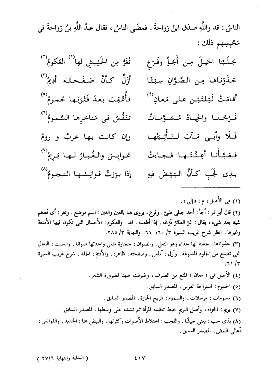 النَّاسُ: قَدْ وَاللَّهِ صَدَقَ ابْنُ رَوَاحَةَ. فَمَضَى النَّاسُ، فَقَالَ عَبْدُ اللَّهِ بْنُ رَوَاحَةَ فِي مَحْبِسِهِمْ ذَلِكَ: