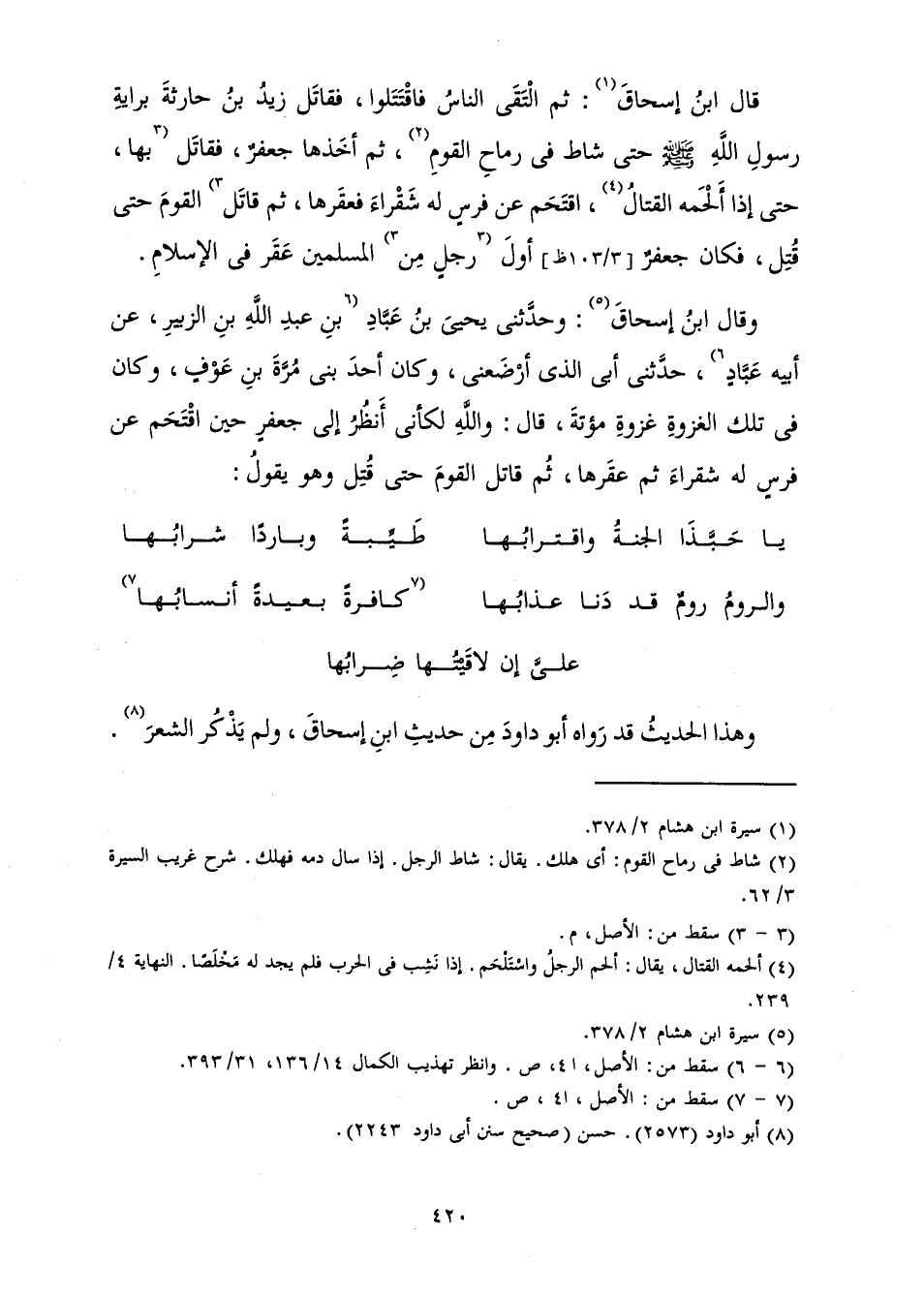 قَالَ ابْنُ إِسْحَاقَ: ثُمَّ الْتَقَى النَّاسُ فَاقْتَتَلُوا، فَقَاتَلَ زَيْدُ بْنُ حَارِثَةَ بِرَايَةِ رَسُولِ اللَّهِ صَلَّى اللَّهُ عَلَيْهِ وَسَلَّمَ حَتَّى شَاطَ فِي رِمَاحِ الْقَوْمِ، ثُمَّ أَخَذَهَا جَعْفَرٌ، فَقَاتَلَ بِهَا، حَتَّى إِذَا أَلْحَمَهُ الْقِتَالُ، اقْتَحَمَ عَنْ فَرَسٍ لَهُ شَقْرَاءَ فَعَقَرَهَا، ثُمَّ قَاتَلَ الْقَوْمَ حَتَّى قُتِلَ فَكَانَ جَعْفَرٌ أَوَّلَ رَجُلٍ مِنَ الْمُسْلِمِينَ عَقَرَ فِي الْإِسْلَامِ.