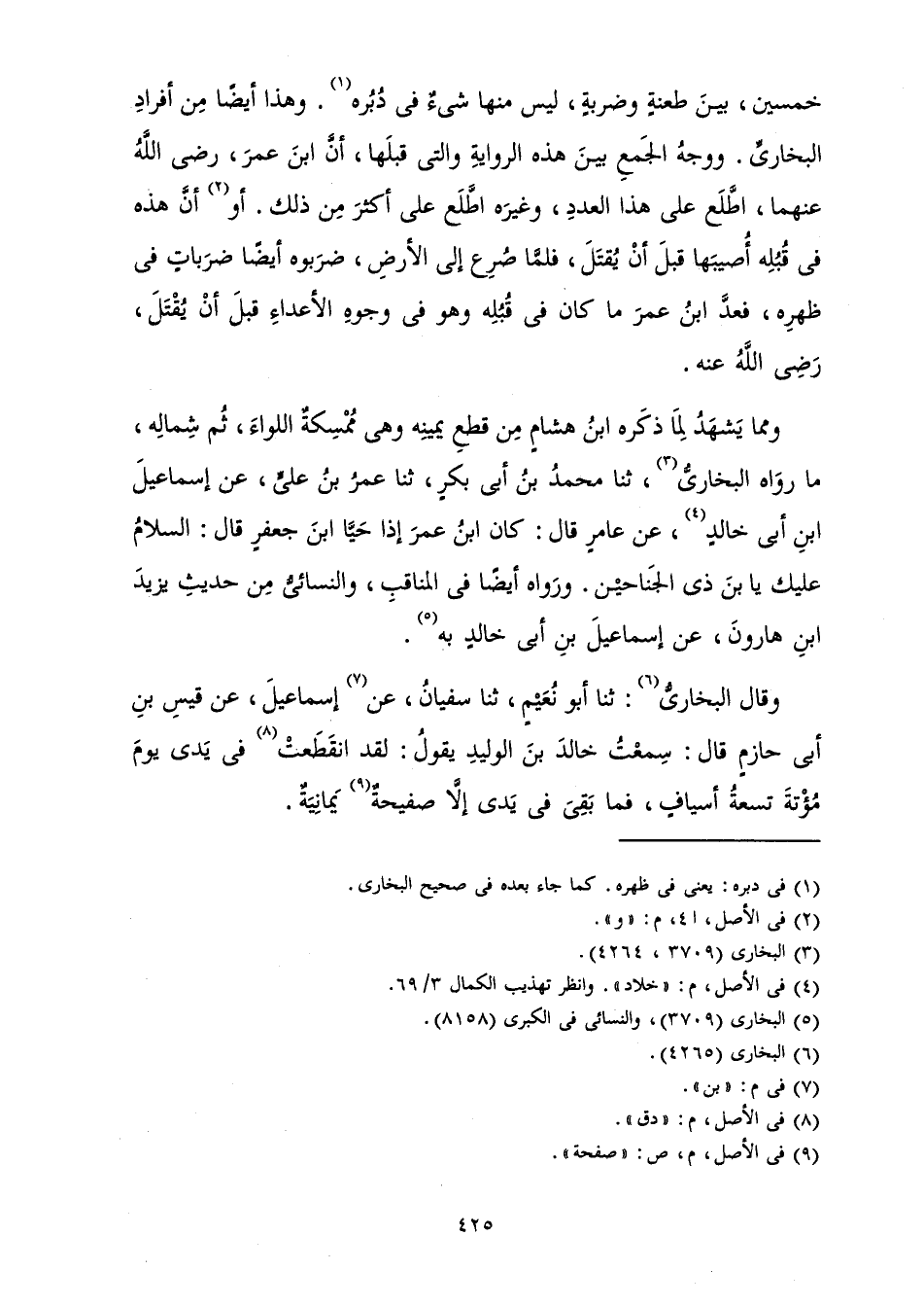 خَمْسِينَ، بَيْنَ طَعْنَةٍ وَضَرْبَةٍ، لَيْسَ مِنْهَا شَيْءٌ فِي دُبُرِهِ، وَهَذَا أَيْضًا مِنْ أَفْرَادِ الْبُخَارِيِّ. وَوَجْهُ الْجَمْعِ بَيْنَ هَذِهِ الرِّوَايَةِ وَالَّتِي قَبْلَهَا، أَنَّ ابْنَ عُمَرَ، رَضِيَ اللَّهُ عَنْهُمَا اطَّلَعَ عَلَى هَذَا الْعَدَدِ، وَغَيْرَهُ اطَّلَعَ عَلَى أَكْثَرَ مِنْ ذَلِكَ. أَوْ أَنَّ هَذِهِ فِي قُبُلِهِ أُصِيبَهَا قَبْلَ أَنْ يُقْتَلَ، فَلَمَّا صُرِعَ إِلَى الْأَرْضِ ضَرَبُوهُ أَيْضًا ضَرَبَاتٍ فِي ظَهْرِهِ، فَعَدَّ ابْنُ عُمَرَ مَا كَانَ فِي قُبُلِهِ وَهُوَ فِي وُجُوهِ الْأَعْدَاءِ قَبْلَ أَنْ يُقْتَلَ، رَضِيَ اللَّهُ عَنْهُ.