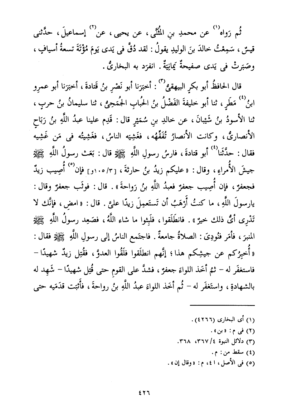 قَالَ الْحَافِظُ أَبُو بَكْرٍ الْبَيْهَقِيُّ: أَخْبَرَنَا أَبُو نَصْرِ بْنُ قَتَادَةَ، أَخْبَرَنَا أَبُو عَمْرِو بْنُ مَطَرٍ، ثَنَا أَبُو خَلِيفَةَ الْفَضْلُ بْنُ الْحُبَابِ الْجُمَحِيُّ، ثَنَا سُلَيْمَانُ بْنُ حَرْبٍ، ثَنَا الْأَسْوَدُ بْنُ شَيْبَانَ، عَنْ خَالِدِ بْنِ سُمَيْرٍ قَالَ: قَدِمَ عَلَيْنَا عَبْدُ اللَّهِ بْنُ رَبَاحٍ الْأَنْصَارِيُّ، وَكَانَتِ الْأَنْصَارُ تُفَقِّهُهُ، فَغَشِيَهُ النَّاسُ، فَغَشِيتُهُ فِي مَنْ غَشِيَهُ فَقَالَ: حَدَّثَنَا أَبُو قَتَادَةَ، فَارِسُ رَسُولِ اللَّهِ صَلَّى اللَّهُ عَلَيْهِ وَسَلَّمَ قَالَ: «بَعَثَ رَسُولُ اللَّهِ صَلَّى اللَّهُ عَلَيْهِ وَسَلَّمَ جَيْشَ الْأُمَرَاءِ، وَقَالَ: " عَلَيْكُمْ زَيْدُ بْنُ حَارِثَةَ، فَإِنْ أُصِيبَ زَيْدٌ فَجَعْفَرٌ، فَإِنْ أُصِيبَ جَعْفَرٌ فَعَبْدُ اللَّهِ بْنُ رَوَاحَةَ ". قَالَ: فَوَثَبَ جَعْفَرٌ وَقَالَ: يَا رَسُولَ اللَّهِ، مَا كُنْتُ أَرْهَبُ أَنْ تَسْتَعْمِلَ زَيْدًا عَلَيَّ. قَالَ: " امْضِ، فَإِنَّكَ لَا تَدْرِي أَيُّ ذَلِكَ خَيْرٌ " فَانْطَلَقُوا، فَلَبِثُوا مَا شَاءَ اللَّهُ، فَصَعِدَ رَسُولُ اللَّهِ صَلَّى اللَّهُ عَلَيْهِ وَسَلَّمَ الْمِنْبَرَ، فَأَمَرَ فَنُودِيَ: الصَّلَاةُ جَامِعَةٌ. فَاجْتَمَعَ النَّاسُ عَلَى رَسُولِ اللَّهِ صَلَّى اللَّهُ عَلَيْهِ وَسَلَّمَ فَقَالَ: " أُخْبِرُكُمْ عَنْ جَيْشِكُمْ هَذَا، إِنَّهُمُ انْطَلَقُوا فَلَقُوا الْعَدُوَّ، فَقُتِلَ زَيْدٌ شَهِيدًا - فَاسْتَغْفَرَ لَهُ - ثُمَّ أَخَذَ اللِّوَاءَ جَعْفَرٌ، فَشَدَّ عَلَى الْقَوْمِ حَتَّى قُتِلَ شَهِيدًا - شَهِدَ لَهُ بِالشَّهَادَةِ وَاسْتَغْفَرَ لَهُ - ثُمَّ أَخَذَ اللِّوَاءَ عَبْدُ اللَّهِ بْنُ رَوَاحَةَ، فَأَثْبَتَ قَدَمَيْهِ حَتَّى