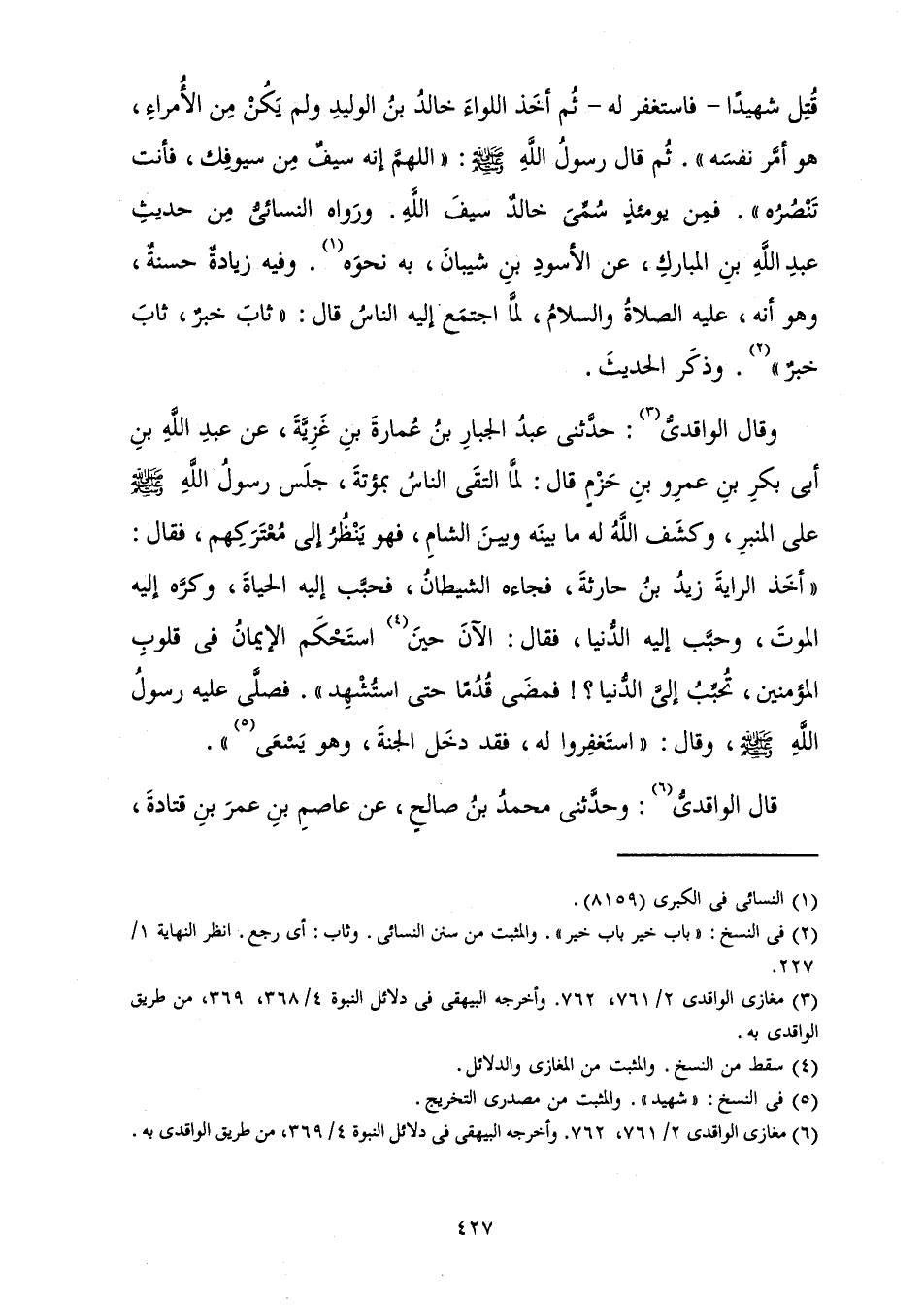 قُتِلَ شَهِيدًا - فَاسْتَغْفَرَ لَهُ - ثُمَّ أَخَذَ اللِّوَاءَ خَالِدُ بْنُ الْوَلِيدِ وَلَمْ يَكُنْ مِنَ الْأُمَرَاءِ، هُوَ أَمَّرَ نَفْسَهُ " ثُمَّ قَالَ رَسُولُ اللَّهِ صَلَّى اللَّهُ عَلَيْهِ وَسَلَّمَ: " اللَّهُمَّ إِنَّهُ سَيْفٌ مِنْ سُيُوفِكَ، فَأَنْتَ تَنْصُرُهُ ". فَمِنْ يَوْمَئِذٍ سُمِّيَ خَالِدٌ سَيْفَ اللَّهِ» . وَرَوَاهُ النَّسَائِيُّ مِنْ حَدِيثِ عَبْدِ اللَّهِ بْنِ الْمُبَارَكِ، عَنِ الْأَسْوَدِ بْنِ شَيْبَانَ، بِهِ نَحْوَهُ. وَفِيهِ زِيَادَةٌ حَسَنَةٌ، وَهُوَ أَنَّهُ عَلَيْهِ الصَّلَاةُ وَالسَّلَامُ لَمَّا اجْتَمَعَ إِلَيْهِ النَّاسُ قَالَ: " ثَابَ خَبَرٌ، ثَابَ خَبَرٌ وَذَكَرَ الْحَدِيثَ.