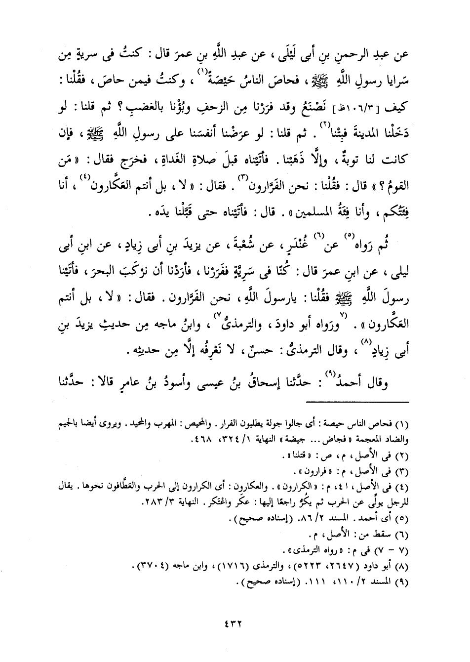 ، عَنْ عَبْدِ الرَّحْمَنِ بْنِ أَبِي لَيْلَى، عَنْ عَبْدِ اللَّهِ بْنِ عُمَرَ قَالَ: «كُنْتُ فِي سَرِيَّةٍ مِنْ سَرَايَا رَسُولِ اللَّهِ صَلَّى اللَّهُ عَلَيْهِ وَسَلَّمَ، فَحَاصَ النَّاسُ حَيْصَةً، وَكُنْتُ فِيمَنْ حَاصَ، فَقُلْنَا: كَيْفَ نَصْنَعُ وَقَدْ فَرَرْنَا مِنَ الزَّحْفِ وَبُؤْنَا بِالْغَضَبِ؟ ثُمَّ قُلْنَا: لَوْ دَخَلْنَا الْمَدِينَةَ فَبِتْنَا. ثُمَّ قُلْنَا: لَوْ عَرَضْنَا أَنْفُسَنَا عَلَى رَسُولِ اللَّهِ صَلَّى اللَّهُ عَلَيْهِ وَسَلَّمَ، فَإِنْ كَانَتْ لَنَا تَوْبَةٌ، وَإِلَّا ذَهَبْنَا. فَأَتَيْنَاهُ قَبْلَ صَلَاةِ الْغَدَاةِ، فَخَرَجَ فَقَالَ: " مَنِ الْقَوْمُ؟ " قَالَ: فَقُلْنَا: نَحْنُ الْفَرَّارُونَ. فَقَالَ: " لَا، بَلْ أَنْتُمُ الْعَكَّارُونَ، أَنَا فِئَتُكُمْ، وَأَنَا فِئَةُ الْمُسْلِمِينَ ". قَالَ: فَأَتَيْنَاهُ حَتَّى قَبَّلْنَا يَدَهُ» .