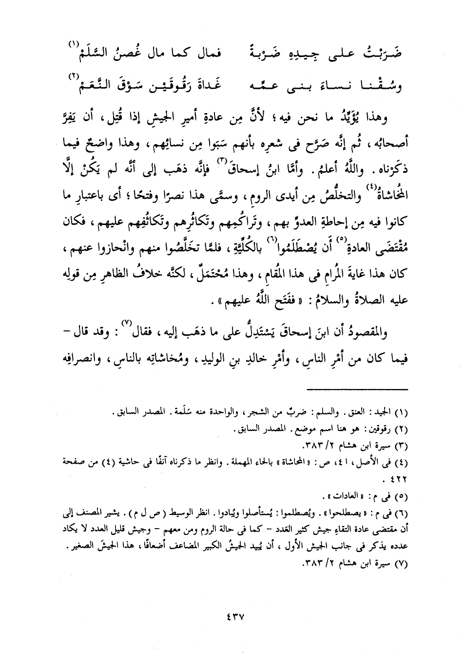 وَالْمَقْصُودُ أَنَّ ابْنَ إِسْحَاقَ يَسْتَدِلُّ عَلَى مَا ذَهَبَ إِلَيْهِ فَقَالَ: وَقَدْ قَالَ - فِيمَا كَانَ مِنْ أَمْرِ النَّاسِ، وَأَمْرِ خَالِدِ بْنِ الْوَلِيدِ، وَمُخَاشَاتِهِ بِالنَّاسِ وَانْصِرَافِهِ