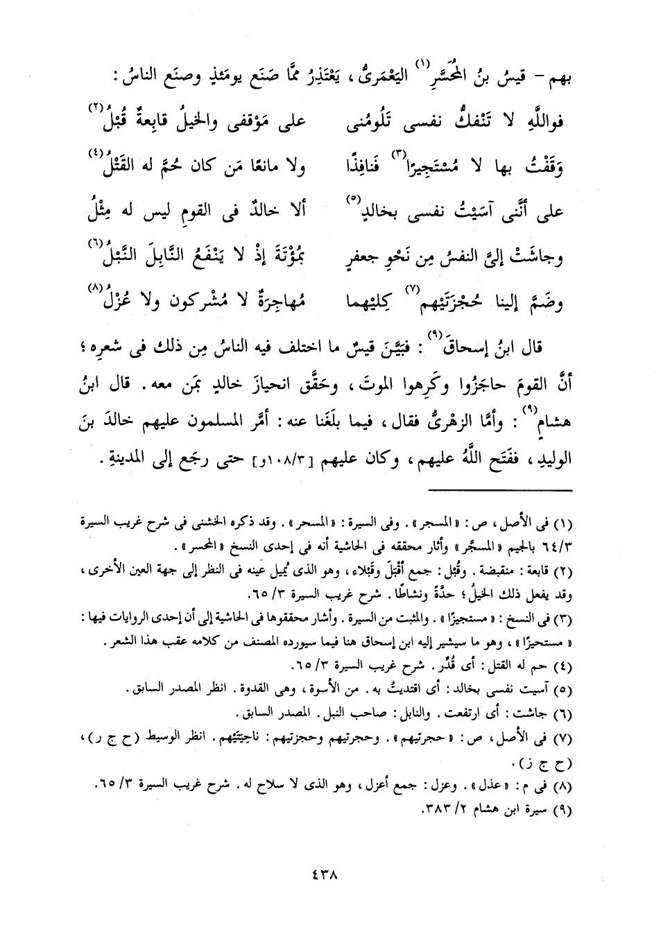 قَالَ ابْنُ إِسْحَاقَ: فَبَيَّنَ قَيْسٌ مَا اخْتَلَفَ فِيهِ النَّاسُ مِنْ ذَلِكَ فِي شِعْرِهِ، أَنَّ الْقَوْمَ حَاجَزُوا وَكَرِهُوا الْمَوْتَ، وَحَقَّقَ انْحِيَازَ خَالِدٍ بِمَنْ مَعَهُ. قَالَ ابْنُ هِشَامٍ: وَأَمَّا الزُّهْرِيُّ فَقَالَ، فِيمَا بَلَغَنَا عَنْهُ: أَمَّرَ الْمُسْلِمُونَ عَلَيْهِمْ خَالِدَ بْنَ الْوَلِيدِ، فَفَتَحَ اللَّهُ عَلَيْهِمْ، وَكَانَ عَلَيْهِمْ حَتَّى رَجَعَ إِلَى الْمَدِينَةِ.
