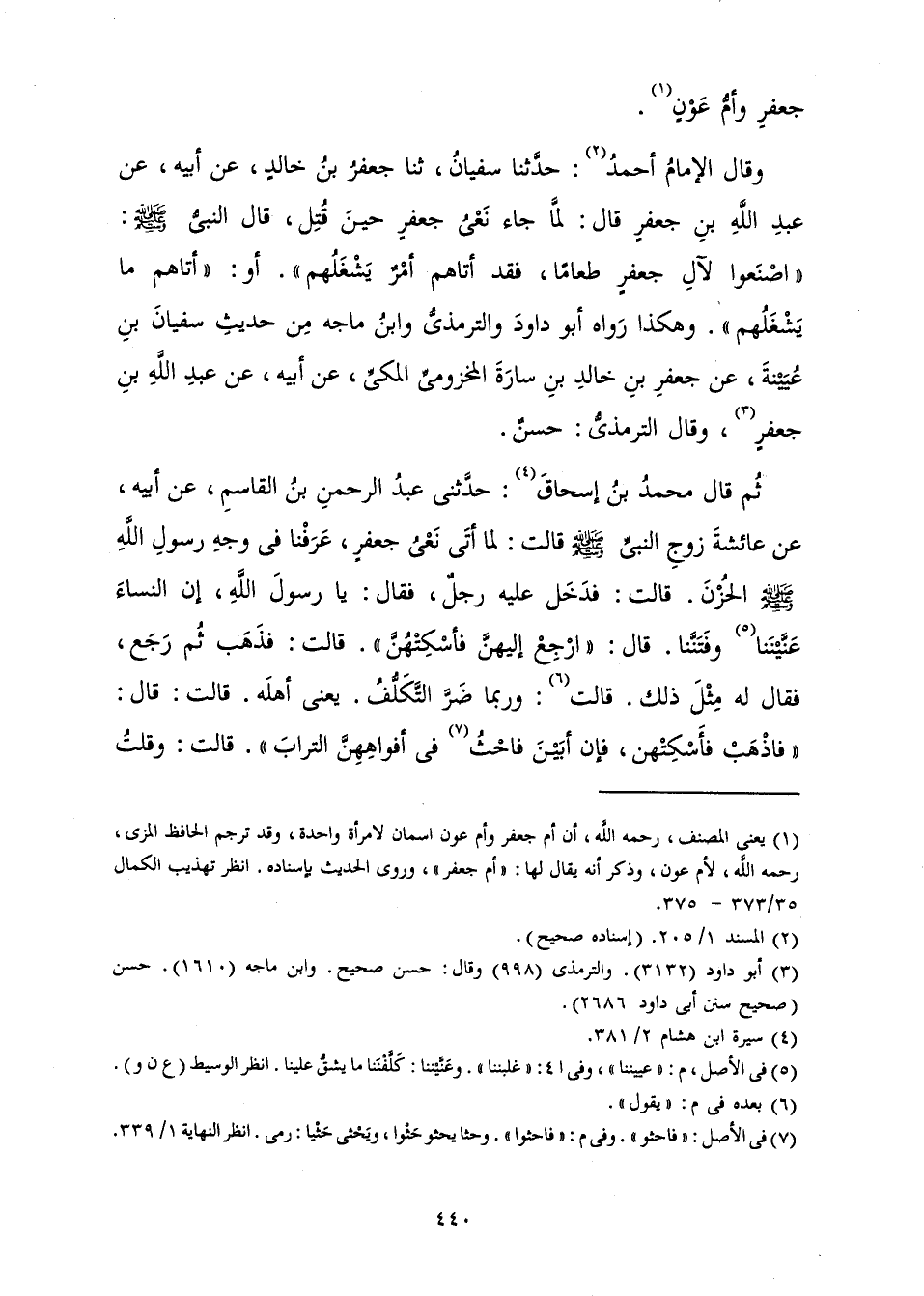 وَقَالَ الْإِمَامُ أَحْمَدُ: حَدَّثَنَا سُفْيَانُ، ثَنَا جَعْفَرُ بْنُ خَالِدٍ، عَنْ أَبِيهِ، عَنْ عَبْدِ اللَّهِ بْنِ جَعْفَرٍ قَالَ: «لَمَّا جَاءَ نَعْيُ جَعْفَرٍ حِينَ قُتِلَ، قَالَ النَّبِيُّ صَلَّى اللَّهُ عَلَيْهِ وَسَلَّمَ: " اصْنَعُوا لِآلِ جَعْفَرٍ طَعَامًا، فَقَدْ أَتَاهُمْ أَمْرٌ يَشْغَلُهُمْ» أَوْ: «أَتَاهُمْ مَا يَشْغَلُهُمْ» وَهَكَذَا رَوَاهُ أَبُو دَاوُدَ وَالتِّرْمِذِيُّ وَابْنُ مَاجَهْ مِنْ حَدِيثِ سُفْيَانَ بْنِ عُيَيْنَةَ عَنْ جَعْفَرِ بْنِ خَالِدِ بْنِ سَارَةَ الْمَخْزُومِيِّ الْمَكِّيِّ، عَنْ أَبِيهِ، عَنْ عَبْدِ اللَّهِ بْنِ جَعْفَرٍ، وَقَالَ التِّرْمِذِيُّ: حَسَنٌ.