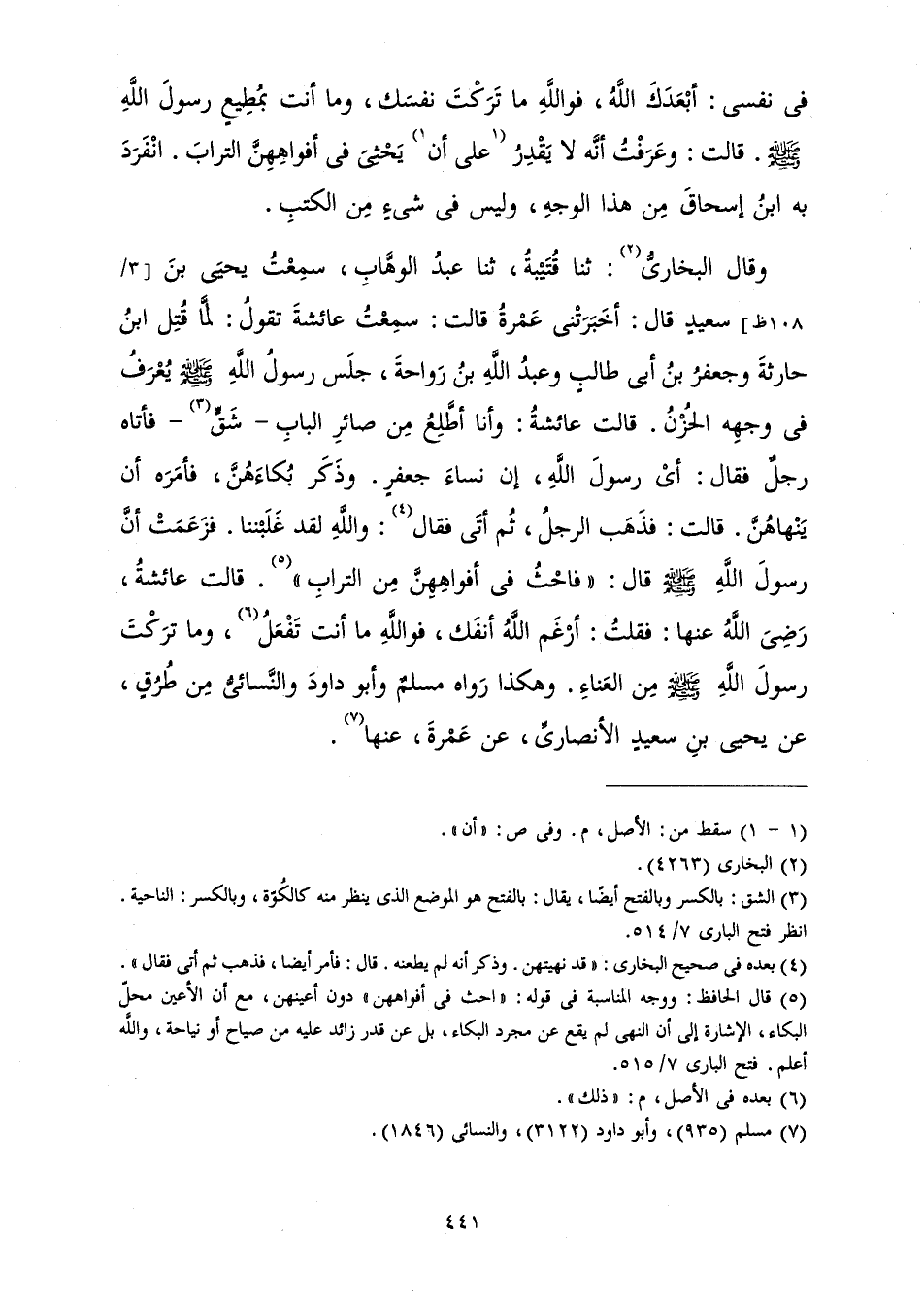 وَقَالَ الْبُخَارِيُّ: ثَنَا قُتَيْبَةُ، ثَنَا عَبْدُ الْوَهَّابِ، سَمِعْتُ يَحْيَى بْنَ سَعِيدٍ قَالَ: أَخْبَرَتْنِي عَمْرَةُ قَالَتْ: سَمِعْتُ عَائِشَةَ تَقُولُ: «لَمَّا قُتِلَ زَيْدُ بْنُ حَارِثَةَ وَجَعْفَرُ بْنُ أَبِي طَالِبٍ وَعَبْدُ اللَّهِ بْنُ رَوَاحَةَ، جَلَسَ رَسُولُ اللَّهِ صَلَّى اللَّهُ عَلَيْهِ وَسَلَّمَ يُعْرَفُ فِي وَجْهِهِ الْحُزْنُ. قَالَتْ عَائِشَةُ: وَأَنَا أَطَّلِعُ مِنْ صَائِرِ الْبَابِ - شَقٍّ - فَأَتَاهُ رَجُلٌ فَقَالَ: أَيْ رَسُولَ اللَّهِ، إِنَّ نِسَاءَ جَعْفَرٍ. وَذَكَرَ بُكَاءَهُنَّ، فَأَمَرَهُ أَنْ يَنْهَاهُنَّ. قَالَتْ: فَذَهَبَ الرَّجُلُ، ثُمَّ أَتَى فَقَالَ: وَاللَّهِ لَقَدْ غَلَبْنَنَا. فَزَعَمَتْ أَنَّ رَسُولَ اللَّهِ صَلَّى اللَّهُ عَلَيْهِ وَسَلَّمَ قَالَ: " فَاحْثُ فِي أَفْوَاهِهِنَّ مِنَ التُّرَابِ " قَالَتْ عَائِشَةُ، رَضِيَ اللَّهُ عَنْهَا: فَقُلْتُ: أَرْغَمَ اللَّهُ أَنْفَكَ، فَوَاللَّهِ مَا أَنْتَ تَفْعَلُ، وَمَا تَرَكْتَ رَسُولَ اللَّهِ صَلَّى اللَّهُ عَلَيْهِ وَسَلَّمَ مِنَ الْعَنَاءِ» وَهَكَذَا رَوَاهُ مُسْلِمٌ وَأَبُو دَاوُدَ وَالنَّسَائِيُّ مِنْ طُرُقٍ، عَنْ يَحْيَى بْنِ سَعِيدٍ الْأَنْصَارِيِّ، عَنْ عَمْرَةَ، عَنْهَا