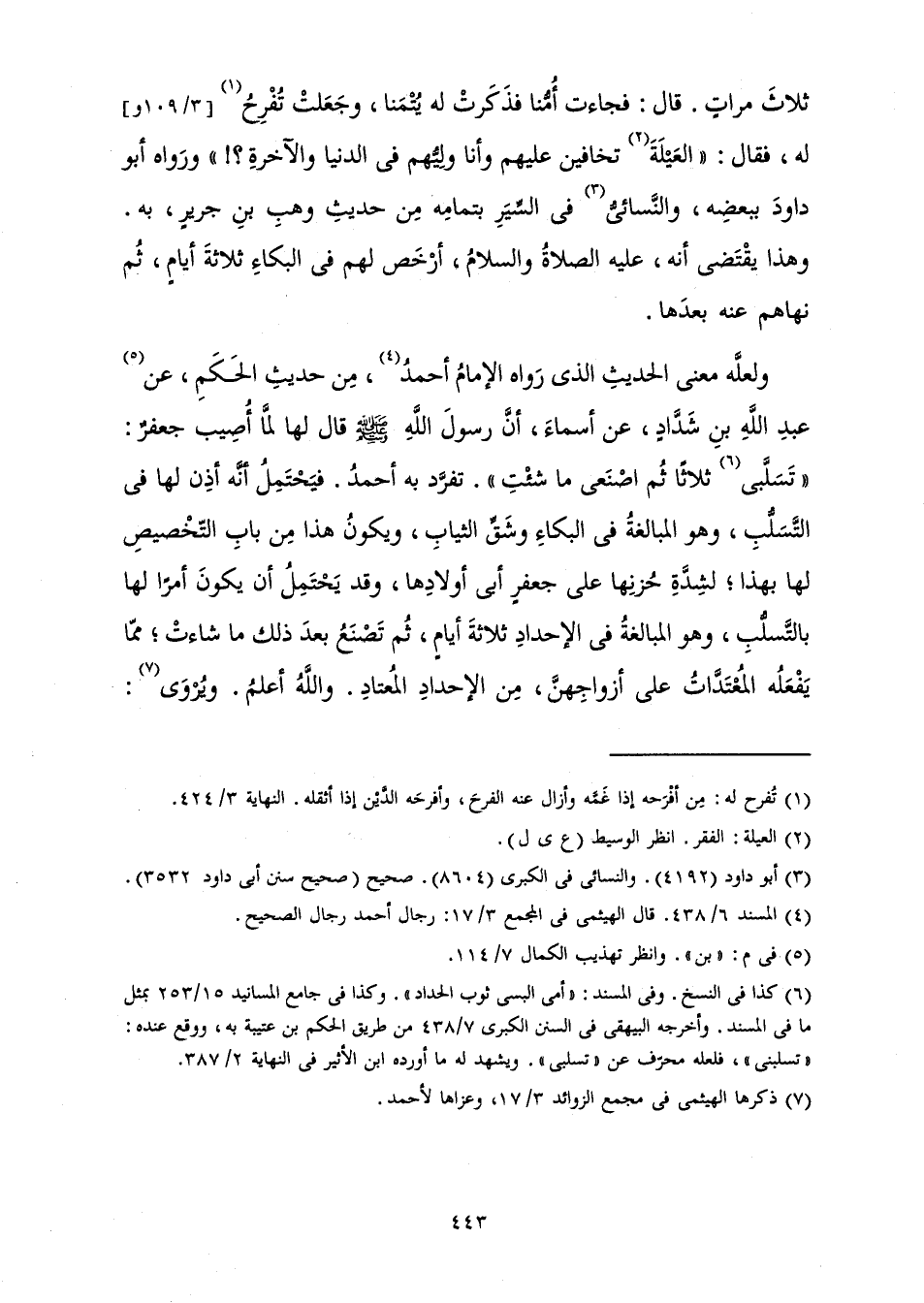 وَلَعَلَّهُ مَعْنَى الْحَدِيثِ الَّذِي رَوَاهُ الْإِمَامُ أَحْمَدُ، مِنْ حَدِيثِ الْحَكَمِ، عَنْ عَبْدِ اللَّهِ بْنِ شَدَّادٍ، عَنْ أَسْمَاءَ، «أَنَّ رَسُولَ اللَّهِ صَلَّى اللَّهُ عَلَيْهِ وَسَلَّمَ قَالَ لَهَا لَمَّا أُصِيبَ جَعْفَرٌ: " تَسَلَّبِي ثَلَاثًا ثُمَّ اصْنَعِي مَا شِئْتِ» تَفَرَّدَ بِهِ أَحْمَدُ. فَيَحْتَمِلُ أَنَّهُ أَذِنَ لَهَا فِي التَّسَلُّبِ، وَهُوَ الْمُبَالَغَةُ فِي الْبُكَاءِ وَشَقِّ الثِّيَابِ، وَيَكُونُ هَذَا مِنْ بَابِ التَّخْصِيصِ لَهَا بِهَذَا، لِشِدَّةِ حُزْنِهَا عَلَى جَعْفَرٍ أَبِي أَوْلَادِهَا، وَقَدْ يَحْتَمِلُ أَنْ يَكُونَ أَمْرًا لَهَا بِالتَّسَلُّبِ، وَهُوَ الْمُبَالَغَةُ فِي الْإِحْدَادِ ثَلَاثَةَ أَيَّامٍ، ثُمَّ تَصْنَعُ بَعْدَ ذَلِكَ مَا شَاءَتْ، مِمَّا يَفْعَلُهُ الْمُعْتَدَّاتُ عَلَى أَزْوَاجِهِنَّ، مِنَ الْإِحْدَادِ الْمُعْتَادِ. وَاللَّهُ أَعْلَمُ. وَيُرْوَى