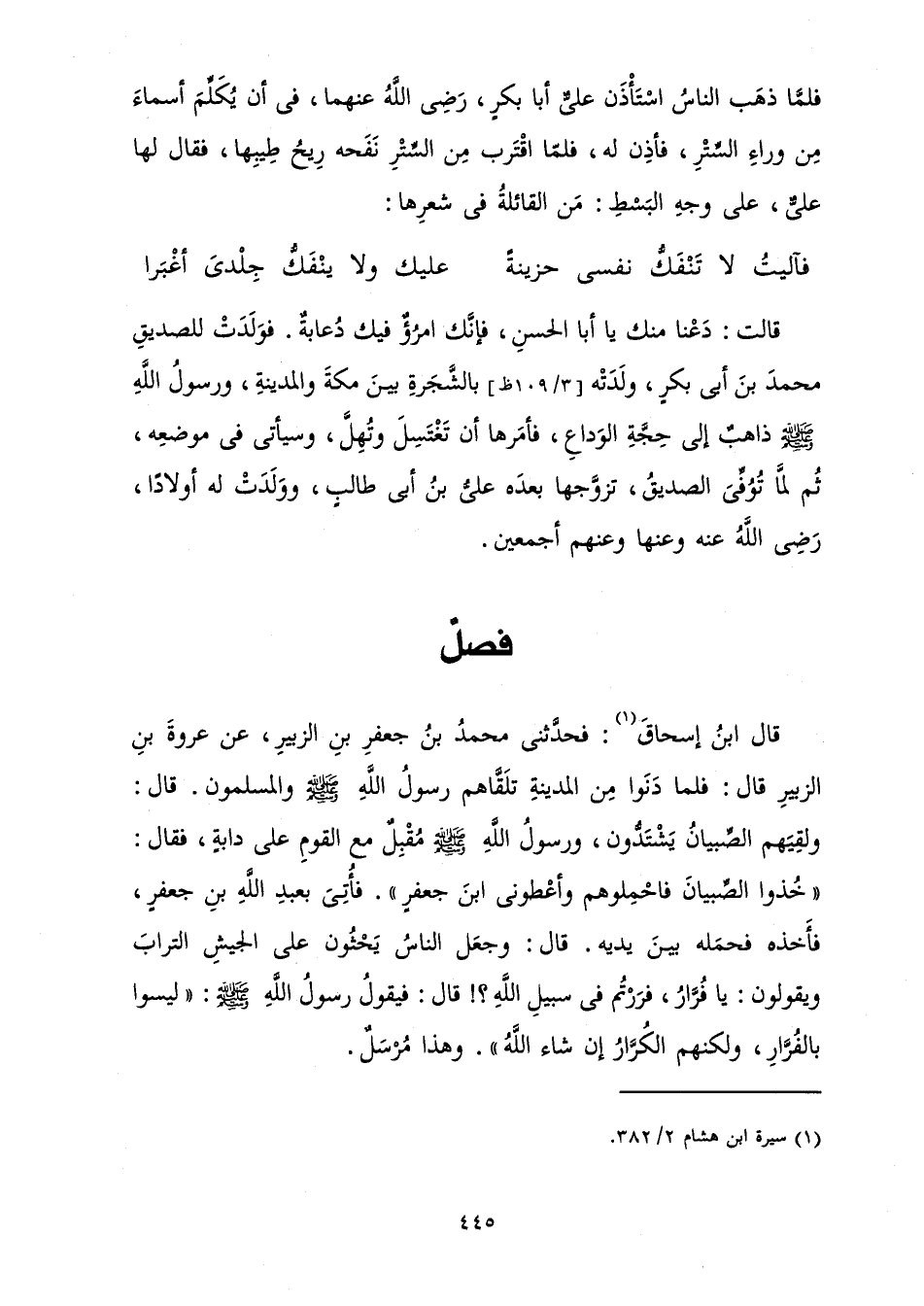 قَالَ ابْنُ إِسْحَاقَ: فَحَدَّثَنِي مُحَمَّدُ بْنُ جَعْفَرِ بْنِ الزُّبَيْرِ، عَنْ عُرْوَةَ بْنِ الزُّبَيْرِ قَالَ: «فَلَمَّا دَنَوْا مِنَ الْمَدِينَةِ تَلَقَّاهُمْ رَسُولُ اللَّهِ صَلَّى اللَّهُ عَلَيْهِ وَسَلَّمَ وَالْمُسْلِمُونَ، قَالَ: وَلَقِيَهُمُ الصِّبْيَانُ يَشْتَدُّونَ، وَرَسُولُ اللَّهِ صَلَّى اللَّهُ عَلَيْهِ وَسَلَّمَ مُقْبِلٌ مَعَ الْقَوْمِ عَلَى دَابَّةٍ، فَقَالَ: " خُذُوا الصِّبْيَانَ فَاحْمِلُوهُمْ وَأَعْطُونِي ابْنَ جَعْفَرٍ ". فَأُتِيَ بِعَبْدِ اللَّهِ بْنِ جَعْفَرٍ، فَأَخَذَهُ فَحَمَلَهُ بَيْنَ يَدَيْهِ. قَالَ: وَجَعَلَ النَّاسُ يَحْثُونَ عَلَى الْجَيْشِ التُّرَابِ وَيَقُولُونَ: يَا فُرَّارُ، فَرَرْتُمْ فِي سَبِيلِ اللَّهِ؟! قَالَ: فَيَقُولُ رَسُولُ اللَّهِ صَلَّى اللَّهُ عَلَيْهِ وَسَلَّمَ: " لَيْسُوا بِالْفُرَّارِ، وَلَكِنَّهُمُ الْكُرَّارُ إِنْ شَاءَ اللَّهُ» وَهَذَا مُرْسَلٌ