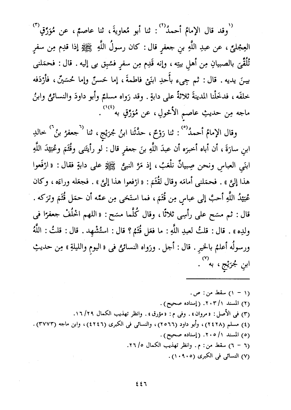 وَقَدْ قَالَ الْإِمَامُ أَحْمَدُ: ثَنَا أَبُو مُعَاوِيَةَ، ثَنَا عَاصِمٌ، عَنْ مُوَرِّقٍ الْعِجْلِيِّ، عَنْ عَبْدِ اللَّهِ بْنِ جَعْفَرٍ قَالَ: «كَانَ رَسُولُ اللَّهِ صَلَّى اللَّهُ عَلَيْهِ وَسَلَّمَ إِذَا قَدِمَ مِنْ سَفَرٍ تُلُقِّيَ بِالصِّبْيَانِ مِنْ أَهْلِ بَيْتِهِ، وَإِنَّهُ قَدِمَ مِنْ سَفَرٍ فَسُبِقَ بِي إِلَيْهِ. قَالَ: فَحَمَلَنِي بَيْنَ يَدَيْهِ. قَالَ: ثُمَّ جِيءَ بِأَحَدِ ابْنَيْ فَاطِمَةَ، إِمَّا حَسَنٌ وَإِمَّا حُسَيْنٌ، فَأَرْدَفَهُ خَلْفَهُ، فَدَخَلْنَا الْمَدِينَةَ ثَلَاثَةً عَلَى دَابَّةٍ» وَقَدْ رَوَاهُ مُسْلِمٌ وَأَبُو دَاوُدَ وَالنَّسَائِيُّ وَابْنُ مَاجَهْ مِنْ حَدِيثِ عَاصِمٍ الْأَحْوَلِ، عَنْ مُوَرِّقٍ بِهِ.