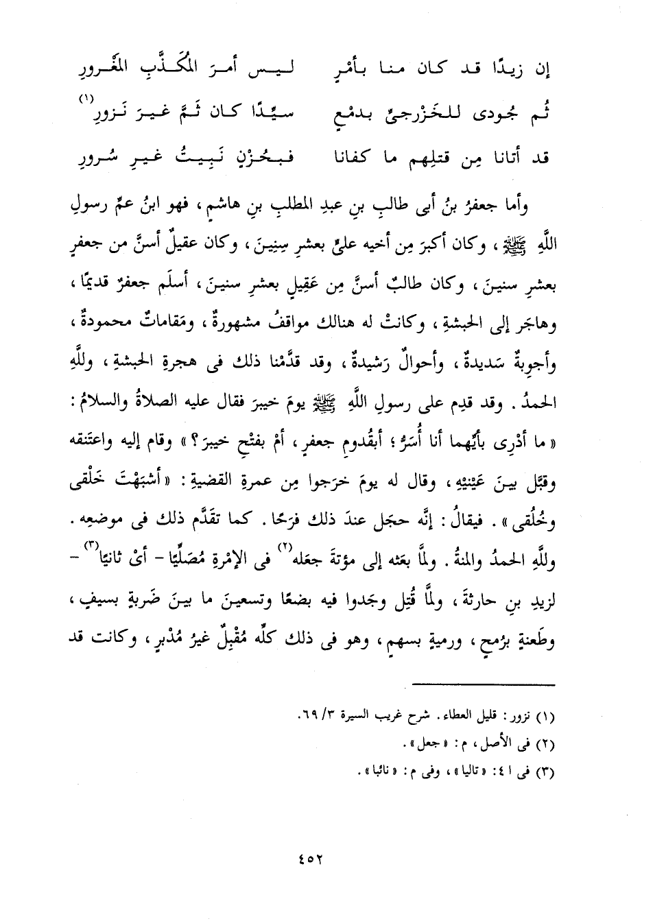 وَأَمَّا جَعْفَرُ بْنُ أَبِي طَالِبِ بْنِ عَبْدِ الْمُطَّلِبِ بْنِ هَاشِمٍ، فَهُوَ ابْنُ عَمِّ رَسُولِ اللَّهِ صَلَّى اللَّهُ عَلَيْهِ وَسَلَّمَ، وَكَانَ أَكْبَرُ مِنْ أَخِيهِ عَلِيٍّ بِعَشْرِ سِنِينَ، وَكَانَ عَقِيلٌ أَسَنَّ مِنْ جَعْفَرٍ بِعَشْرِ سِنِينَ، وَكَانَ طَالِبٌ أَسَنَّ مِنْ عَقِيلٍ بِعَشْرِ سِنِينَ، أَسْلَمَ جَعْفَرٌ قَدِيمًا، وَهَاجَرَ إِلَى الْحَبَشَةِ، وَكَانَتْ لَهُ هُنَالِكَ مَوَاقِفُ مَشْهُورَةٌ، وَمَقَامَاتٌ مَحْمُودَةٌ، وَأَجْوِبَةٌ سَدِيدَةٌ، وَأَحْوَالٌ رَشِيدَةٌ، وَقَدْ قَدَّمْنَا ذَلِكَ فِي هِجْرَةِ الْحَبَشَةِ، وَلِلَّهِ الْحَمْدُ. وَقَدْ قَدِمَ عَلَى رَسُولِ اللَّهِ صَلَّى اللَّهُ عَلَيْهِ وَسَلَّمَ يَوْمَ خَيْبَرَ فَقَالَ عَلَيْهِ الصَّلَاةُ وَالسَّلَامُ: «مَا أَدْرِي بِأَيِّهِمَا أَنَا أُسَرُّ، أَبِقُدُومِ جَعْفَرٍ، أَمْ بِفَتْحِ خَيْبَرَ؟» وَقَامَ إِلَيْهِ وَاعْتَنَقَهُ وَقَبَّلَ بَيْنِ عَيْنَيْهِ، وَقَالَ لَهُ يَوْمَ خَرَجُوا مِنْ عُمْرَةِ الْقَضِيَّةِ: «أَشْبَهْتَ خَلْقِي وَخُلُقِي» فَيُقَالُ: إِنَّهُ حَجَلَ عِنْدَ ذَلِكَ فَرَحًا. كَمَا تَقَدَّمَ ذَلِكَ فِي مَوْضِعِهِ. وَلِلَّهِ الْحَمْدُ وَالْمِنَّةُ. وَلَمَّا بَعَثَهُ إِلَى مُؤْتَةَ جَعَلَهُ فِي الْإِمْرَةِ مُصَلِّيًا - أَيْ ثَانِيًا - لِزَيْدِ بْنِ حَارِثَةَ، وَلَمَّا قُتِلَ وَجَدُوا فِيهِ بِضْعًا وَتِسْعِينَ مَا بَيْنَ ضَرْبَةٍ بِسَيْفٍ، وَطَعْنَةٍ بِرُمْحٍ، وَرَمْيَةٍ بِسَهْمٍ، وَهُوَ فِي ذَلِكَ كُلِّهِ مُقْبِلٌ غَيْرَ مُدْبِرٍ، وَكَانَتْ قَدْ