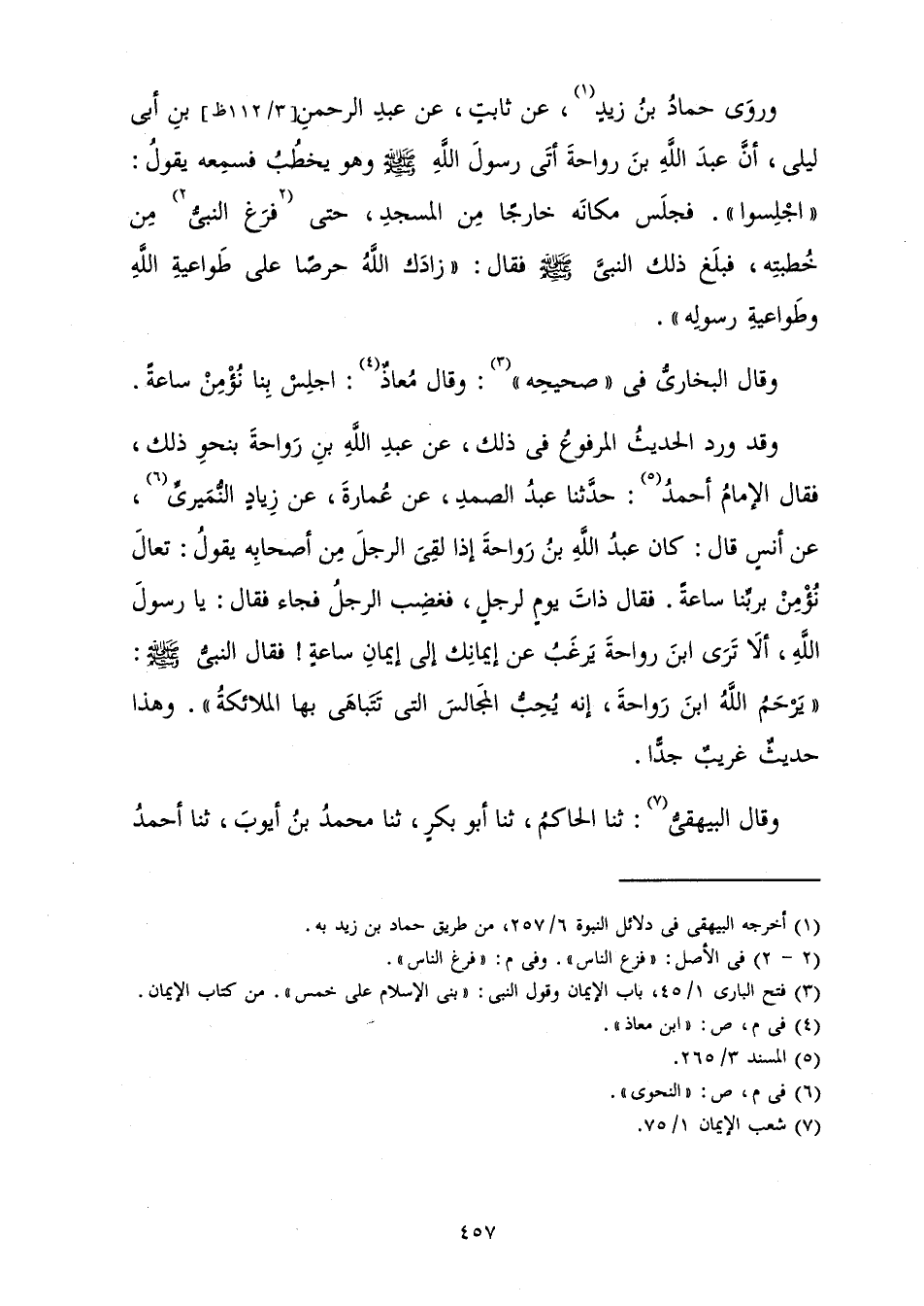 وَقَدْ وَرَدَ الْحَدِيثُ الْمَرْفُوعُ فِي ذَلِكَ، عَنْ عَبْدِ اللَّهِ بْنِ رَوَاحَةَ بِنَحْوِ ذَلِكَ، فَقَالَ الْإِمَامُ أَحْمَدُ: حَدَّثَنَا عَبْدُ الصَّمَدِ، عَنْ عِمَارَةَ، عَنْ زِيَادٍ النُّمَيْرِيِّ، عَنْ أَنَسٍ قَالَ: «كَانَ عَبْدُ اللَّهِ بْنُ رَوَاحَةَ إِذَا لَقِيَ الرَّجُلَ مِنْ أَصْحَابِهِ يَقُولُ: تَعَالَ نُؤْمِنْ بِرَبِّنَا سَاعَةً. فَقَالَ ذَاتَ يَوْمٍ لِرَجُلٍ، فَغَضِبَ الرَّجُلُ فَجَاءَ فَقَالَ: يَا رَسُولَ اللَّهِ، أَلَا تَرَى ابْنَ رَوَاحَةَ يَرْغَبُ عَنْ إِيمَانِكَ إِلَى إِيمَانِ سَاعَةٍ! فَقَالَ النَّبِيُّ صَلَّى اللَّهُ عَلَيْهِ وَسَلَّمَ: " يَرْحَمُ اللَّهُ ابْنَ رَوَاحَةَ، إِنَّهُ يُحِبُّ الْمَجَالِسَ الَّتِي تَتَبَاهَى بِهَا الْمَلَائِكَةُ» وَهَذَا حَدِيثٌ غَرِيبٌ جِدًّا.