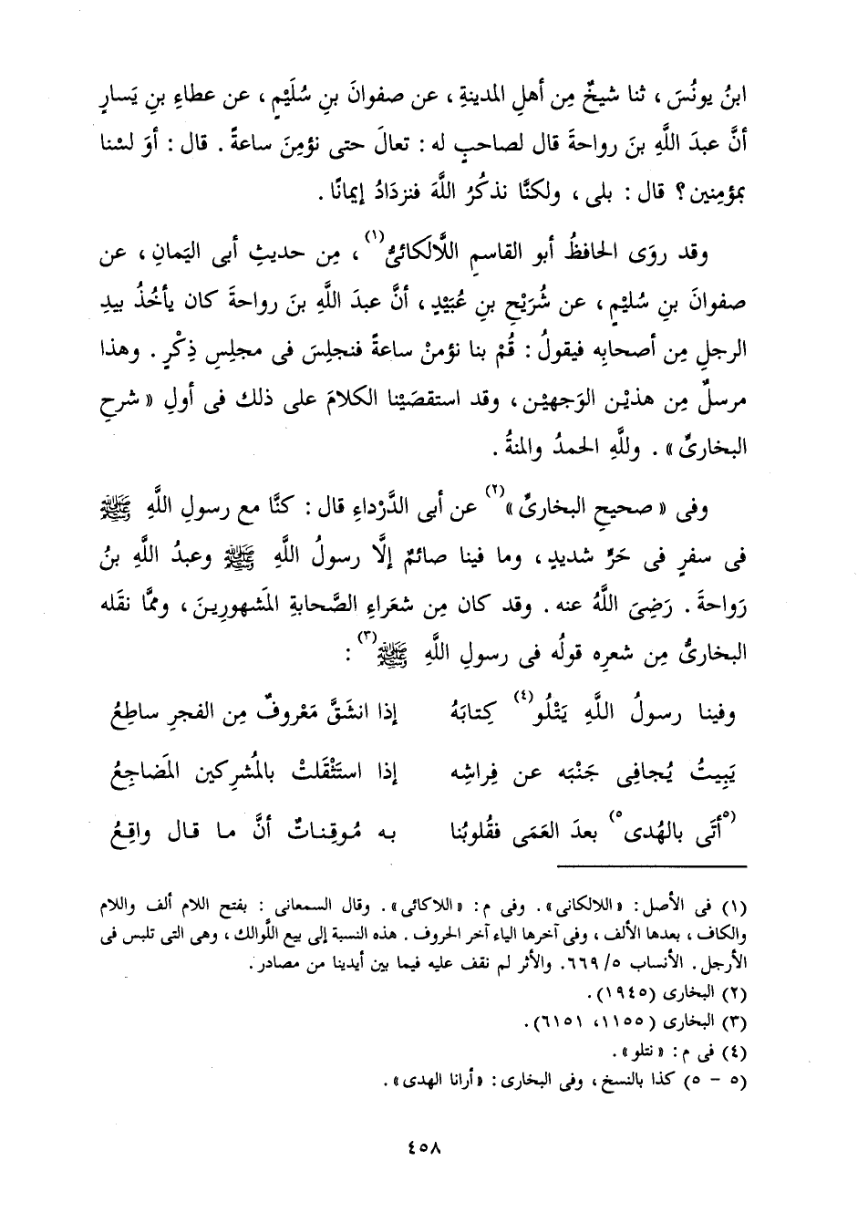 وَفِي " صَحِيحِ الْبُخَارِيِّ " «عَنْ أَبِي الدَّرْدَاءِ قَالَ: كُنَّا مَعَ رَسُولِ اللَّهِ صَلَّى اللَّهُ عَلَيْهِ وَسَلَّمَ فِي سَفَرٍ فِي حَرٍّ شَدِيدٍ، وَمَا فِينَا صَائِمٌ إِلَّا رَسُولُ اللَّهِ صَلَّى اللَّهُ عَلَيْهِ وَسَلَّمَ وَعَبْدُ اللَّهِ بْنُ رَوَاحَةَ رَضِيَ اللَّهُ عَنْهُ» وَقَدْ كَانَ مِنْ شُعَرَاءِ الصَّحَابَةِ الْمَشْهُورِينَ، وَمِمَّا نَقَلَهُ الْبُخَارِيُّ مِنْ شِعْرِهِ قَوْلُهُ فِي رَسُولِ اللَّهِ صَلَّى اللَّهُ عَلَيْهِ وَسَلَّمَ: