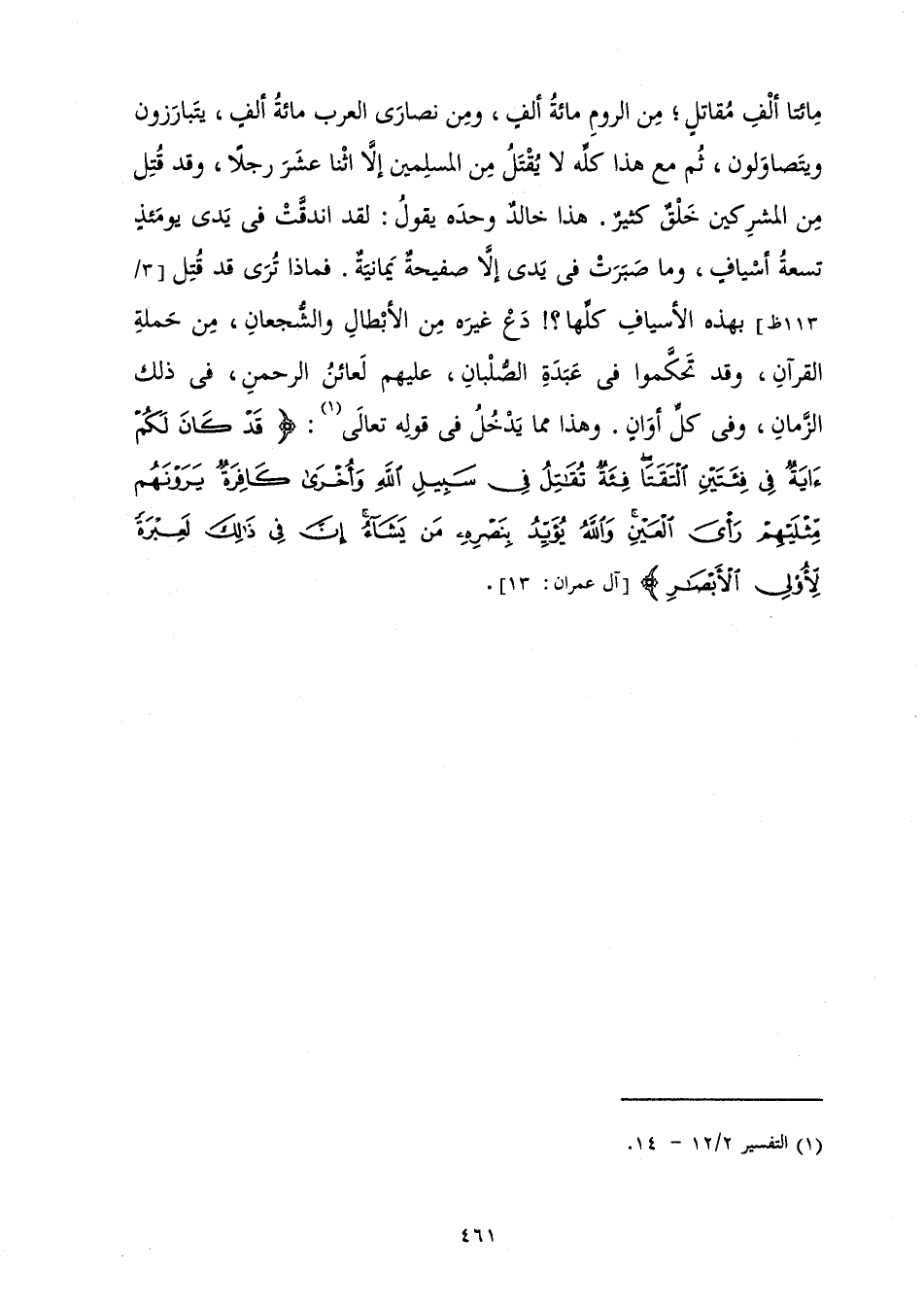 مِائَتَا أَلْفِ مُقَاتِلٍ، مِنَ الرُّومِ مِائَةُ أَلْفٍ، وَمِنْ نَصَارَى الْعَرَبِ مِائَةُ أَلْفٍ، يَتَبَارَزُونَ وَيَتَصَاوَلُونَ، ثُمَّ مَعَ هَذَا كُلِّهِ لَا يُقْتَلُ مِنَ الْمُسْلِمِينَ إِلَّا اثْنَا عَشَرَ رَجُلًا، وَقَدْ قُتِلَ مِنَ الْمُشْرِكِينَ خَلْقٌ كَثِيرٌ. هَذَا خَالِدٌ وَحَدَهُ يَقُولُ: لَقَدِ انْدَقَّتْ فِي يَدِي يَوْمَئِذٍ تِسْعَةُ أَسْيَافٍ، وَمَا صَبَرَتْ فِي يَدِي إِلَّا صَفِيحَةٌ يَمَانِيَةٌ. فَمَاذَا تُرَى قَدْ قُتِلَ بِهَذِهِ الْأَسْيَافِ كُلِّهَا؟! دَعْ غَيْرَهُ مِنَ الْأَبْطَالِ وَالشُّجْعَانِ، مِنْ حَمَلَةِ الْقُرْآنِ، وَقَدْ تَحَكَّمُوا فِي عَبَدَةِ الصُّلْبَانِ، عَلَيْهِمْ لَعَائِنُ الرَّحْمَنِ، فِي ذَلِكَ الزَّمَانِ، وَفِي كُلِّ أَوَانٍ. وَهَذَا مِمَّا يَدْخُلُ فِي قَوْلِهِ تَعَالَى: {قَدْ كَانَ لَكُمْ آيَةٌ فِي فِئَتَيْنِ الْتَقَتَا فِئَةٌ تُقَاتِلُ فِي سَبِيلِ اللَّهِ وَأُخْرَى كَافِرَةٌ يَرَوْنَهُمْ مِثْلَيْهِمْ رَأْيَ الْعَيْنِ وَاللَّهُ يُؤَيِّدُ بِنَصْرِهِ مَنْ يَشَاءُ إِنَّ فِي ذَلِكَ لَعِبْرَةً لِأُولِي الْأَبْصَارِ} [آل عمران: 13] (آلِ عِمْرَانَ: 13) .