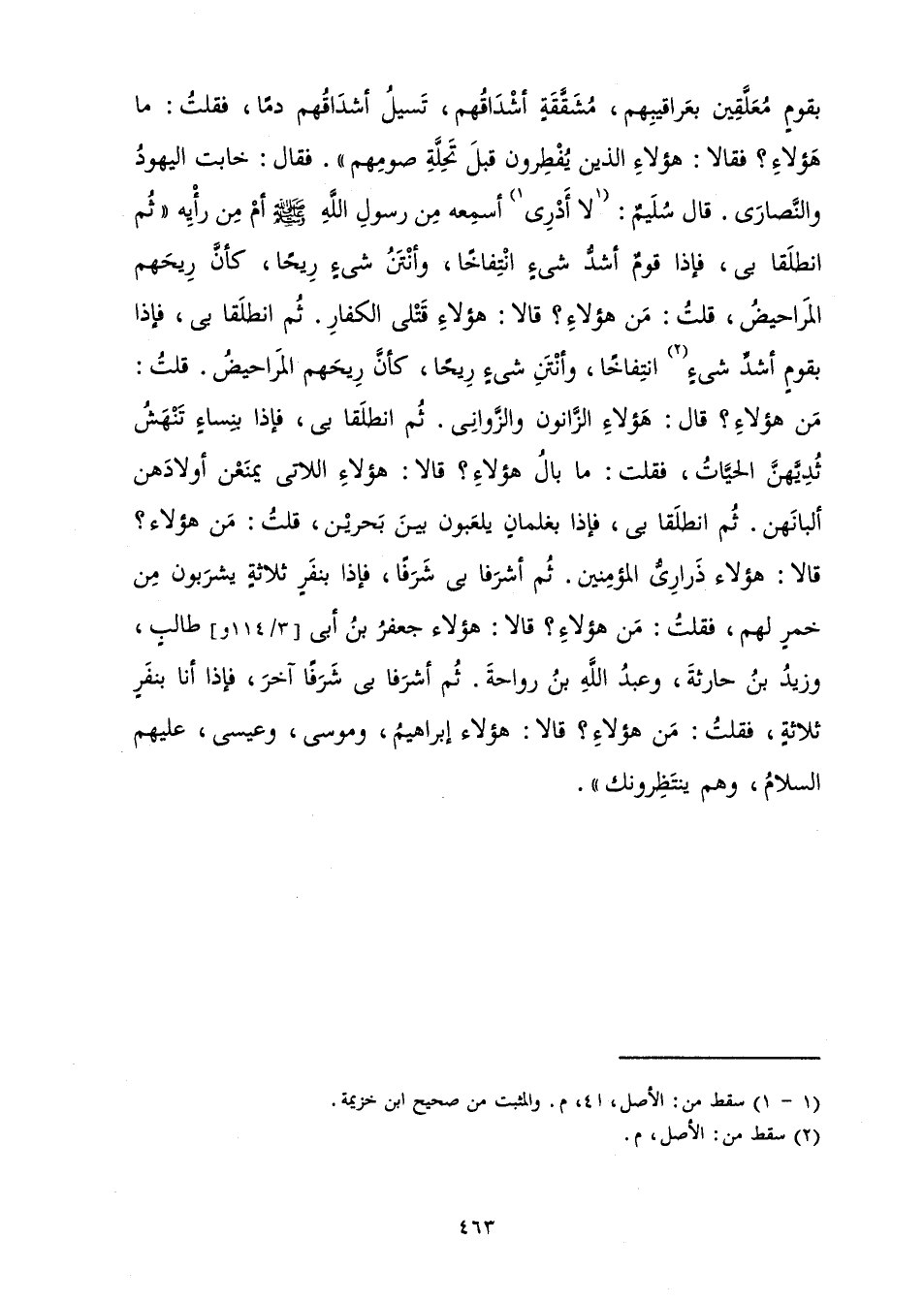 بِقَوْمٍ مُعَلَّقِينَ بِعَرَاقِيبِهِمْ، مُشَقَّقَةٍ أَشْدَاقُهُمْ، تَسِيلُ أَشْدَاقُهُمْ دَمًا، فَقُلْتُ: مَا هَؤُلَاءِ؟ فَقَالَا: هَؤُلَاءِ الَّذِينَ يُفْطِرُونَ قَبْلَ تَحِلَّةِ صَوْمِهِمْ ". فَقَالَ: خَابَتِ الْيَهُودُ وَالنَّصَارَى. قَالَ سُلَيْمٌ: لَا أَدْرِي أَسَمِعَهُ مِنْ رَسُولِ اللَّهِ صَلَّى اللَّهُ عَلَيْهِ وَسَلَّمَ أَمْ مِنْ رَأْيِهِ " ثُمَّ انْطَلَقَا بِي، فَإِذَا قَوْمٌ أَشَدُّ شَيْءٍ انْتِفَاخًا، وَأَنْتَنُ شَيْءٍ رِيحًا، كَأَنَّ رِيحَهُمُ الْمَرَاحِيضُ، قُلْتُ: مَنْ هَؤُلَاءِ؟ قَالَا: هَؤُلَاءِ قَتْلَى الْكُفَّارِ. ثُمَّ انْطَلَقَا بِي، فَإِذَا بِقَوْمٍ أَشَدِّ شَيْءٍ انْتِفَاخًا، وَأَنْتَنِ شَيْءٍ رِيحًا، كَأَنَّ رِيحَهُمُ الْمَرَاحِيضُ. قُلْتُ: مَنْ هَؤُلَاءِ؟ قَالَ: هَؤُلَاءِ الزَّانُونَ وَالزَّوَانِي. ثُمَّ انْطَلَقَا بِي، فَإِذَا بِنِسَاءٍ تَنْهَشُ ثُدِيَّهُنَّ الْحَيَّاتُ، فَقُلْتُ: مَا بَالُ هَؤُلَاءِ؟ قَالَا: هَؤُلَاءِ اللَّاتِي يَمْنَعْنَ أَوْلَادَهُنَّ أَلْبَانَهُنَّ. ثُمَّ انْطَلَقَا بِي، فَإِذَا بِغِلْمَانٍ يَلْعَبُونَ بَيْنَ بَحْرَيْنِ، قُلْتُ: مَنْ هَؤُلَاءِ؟ قَالَا: هَؤُلَاءِ ذَرَارِيُّ الْمُؤْمِنِينَ. ثُمَّ أَشْرَفَا بِي شَرَفًا، فَإِذَا بِنَفَرٍ ثَلَاثَةٍ يَشْرَبُونَ مِنْ خَمْرٍ لَهُمْ، فَقُلْتُ: مَنْ هَؤُلَاءِ؟ قَالَا: هَؤُلَاءِ جَعْفَرُ بْنُ أَبِي طَالِبٍ، وَزَيْدُ بْنُ حَارِثَةَ، وَعَبْدُ اللَّهِ بْنُ رَوَاحَةَ. ثُمَّ أَشْرَفَا بِي شَرَفًا آخَرَ، فَإِذَا أَنَا بِنَفَرٍ ثَلَاثَةٍ، فَقُلْتُ: مَنْ هَؤُلَاءِ؟ قَالَا: هَؤُلَاءِ إِبْرَاهِيمُ، وَمُوسَى، وَعِيسَى عَلَيْهِمُ السَّلَامُ، وَهُمْ يَنْتَظِرُونَكَ» .