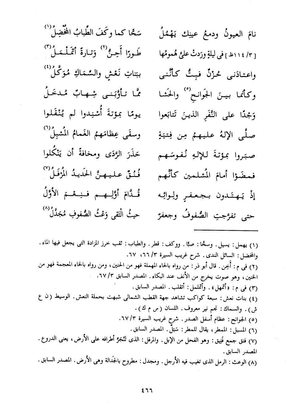 نَامَ الْعُيُونُ وَدَمْعُ عَيْنِكَ يَهْمُلُ ... سَحًّا كَمَا وَكَفَ الطِّبَابُ الْمُخْضِلُ