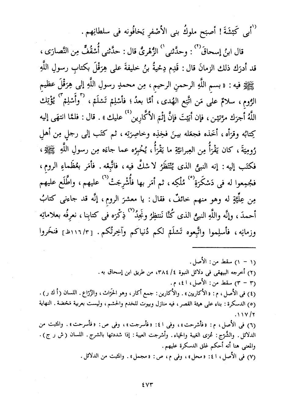 قَالَ ابْنُ إِسْحَاقَ: وَحَدَّثَنِي الزُّهْرِيُّ قَالَ: حَدَّثَنِي أُسْقُفٌّ مِنَ النَّصَارَى، قَدْ أَدْرَكَ ذَلِكَ الزَّمَانَ قَالَ: قَدِمَ دِحْيَةُ بْنُ خَلِيفَةَ عَلَى هِرَقْلَ بِكِتَابِ رَسُولِ اللَّهِ صَلَّى اللَّهُ عَلَيْهِ وَسَلَّمَ فِيهِ: «بِسْمِ اللَّهِ الرَّحْمَنِ الرَّحِيمِ، مِنْ مُحَمَّدٍ رَسُولِ اللَّهِ إِلَى هِرَقْلَ عَظِيمِ الرُّومِ، سَلَامٌ عَلَى مَنِ اتَّبَعَ الْهُدَى، أَمَّا بَعْدُ، فَأَسْلِمْ تَسْلَمْ، وَأَسْلِمْ يُؤْتِكَ اللَّهُ أَجْرَكَ مَرَّتَيْنِ، فَإِنْ أَبَيْتَ فَإِنَّ إِثْمَ الْأَكَّارِينَ عَلَيْكَ» قَالَ: فَلَمَّا انْتَهَى إِلَيْهِ كِتَابُهُ وَقَرَأَهُ، أَخَذَهُ فَجَعَلَهُ بَيْنَ فَخِذِهِ وَخَاصِرَتِهِ، ثُمَّ كَتَبَ إِلَى رَجُلٍ مِنْ أَهْلِ رُومِيَّةَ، كَانَ يَقْرَأُ مِنَ الْعِبْرَانِيَّةِ مَا يَقْرَأُ، يُخْبِرُهُ عَمَّا جَاءَهُ مِنْ رَسُولِ اللَّهِ صَلَّى اللَّهُ عَلَيْهِ وَسَلَّمَ، فَكَتَبَ إِلَيْهِ: إِنَّهُ النَّبِيُّ الَّذِي يُنْتَظَرُ لَا شَكَّ فِيهِ، فَاتَّبِعْهُ. فَأَمَرَ بِعُظَمَاءِ الرُّومِ، فَجُمِعُوا لَهُ فِي دَسْكَرَةِ مُلْكِهِ، ثُمَّ أَمَرَ بِهَا فَأُشْرِجَتْ عَلَيْهِمْ، وَاطَّلَعَ عَلَيْهِمْ مِنْ عِلِّيَّةٍ لَهُ وَهُوَ مِنْهُمْ خَائِفٌ، فَقَالَ: يَا مَعْشَرَ الرُّومِ، إِنَّهُ قَدْ جَاءَنِي كِتَابُ أَحْمَدَ، وَإِنَّهُ وَاللَّهِ النَّبِيُّ الَّذِي كُنَّا نَنْتَظِرُ وَنَجِدُ ذِكْرَهُ فِي كِتَابِنَا، نَعْرِفُهُ بِعَلَامَاتِهِ وَزَمَانِهِ، فَأَسْلِمُوا وَاتَّبِعُوهُ تَسْلَمْ لَكُمْ دُنْيَاكُمْ وَآخِرَتُكُمْ. فَنَخَرُوا