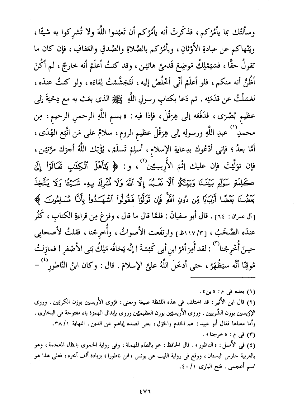 وَسَأَلْتُكَ بِمَا يَأْمُرُكُمْ، فَذَكَرْتَ أَنَّهُ يَأْمُرُكُمْ أَنْ تَعْبُدُوا اللَّهَ وَلَا تُشْرِكُوا بِهِ شَيْئًا، وَيَنْهَاكُمْ عَنْ عِبَادَةِ الْأَوْثَانِ، وَيَأْمُرُكُمْ بِالصَّلَاةِ وَالصِّدْقِ وَالْعَفَافِ، فَإِنْ كَانَ مَا تَقُولُ حَقًّا، فَسَيَمْلِكُ مَوْضِعَ قَدَمَيَّ هَاتَيْنِ، وَقَدْ كُنْتُ أَعْلَمُ أَنَّهُ خَارِجٌ، لَمْ أَكُنْ أَظُنُّ أَنَّهُ مِنْكُمْ، فَلَوْ أَعْلَمُ أَنِّي أَخْلُصُ إِلَيْهِ، لَتَجَشَّمْتُ لِقَاءَهُ، وَلَوْ كُنْتُ عِنْدَهُ، لَغَسَلْتُ عَنْ قَدَمَيْهِ. ثُمَّ دَعَا بِكِتَابِ رَسُولِ اللَّهِ صَلَّى اللَّهُ عَلَيْهِ وَسَلَّمَ الَّذِي بَعَثَ بِهِ مَعَ دِحْيَةَ إِلَى عَظِيمِ بُصْرَى، فَدَفَعَهُ إِلَى هِرَقْلَ، فَإِذَا فِيهِ: «بِسْمِ اللَّهِ الرَّحْمَنِ الرَّحِيمِ، مِنْ مُحَمَّدٍ عَبْدِ اللَّهِ وَرَسُولِهِ إِلَى هِرَقْلَ عَظِيمِ الرُّومِ، سَلَامٌ عَلَى مَنِ اتَّبَعَ الْهُدَى، أَمَّا بَعْدُ، فَإِنِّي أَدْعُوكَ بِدِعَايَةِ الْإِسْلَامِ، أَسْلِمْ تَسْلَمْ، يُؤْتِكَ اللَّهُ أَجْرَكَ مَرَّتَيْنِ، فَإِنْ تَوَلَّيْتَ فَإِنَّ عَلَيْكَ إِثْمُ الْأَرِيسِيِّينَ، وَ: {يَا أَهْلَ الْكِتَابِ تَعَالَوْا إِلَى كَلِمَةٍ سَوَاءٍ بَيْنَنَا وَبَيْنَكُمْ أَلَّا نَعْبُدَ إِلَّا اللَّهَ وَلَا نُشْرِكَ بِهِ شَيْئًا وَلَا يَتَّخِذَ بَعْضُنَا بَعْضًا أَرْبَابًا مِنْ دُونِ اللَّهِ فَإِنْ تَوَلَّوْا فَقُولُوا اشْهَدُوا بِأَنَّا مُسْلِمُونَ} [آل عمران: 64] (آلِ عِمْرَانَ: 64) » قَالَ أَبُو سُفْيَانَ: فَلَمَّا قَالَ مَا قَالَ، وَفَرَغَ مِنْ قِرَاءَةِ الْكِتَابِ، كَثُرَ عِنْدَهُ الصَّخَبُ، وَارْتَفَعَتِ الْأَصْوَاتُ، وَأُخْرِجْنَا، فَقُلْتُ لِأَصْحَابِي حِينَ أُخْرِجْنَا: لَقَدْ أَمِرَ أَمْرُ ابْنِ أَبِي كَبْشَةَ! إِنَّهُ يَخَافُهُ مَلِكُ بَنِي الْأَصْفَرِ! فَمَا زِلْتُ مُوقِنًا أَنَّهُ سَيَظْهَرُ، حَتَّى أَدْخَلَ اللَّهُ عَلَيَّ الْإِسْلَامَ. قَالَ: وَكَانَ ابْنُ النَّاطُورِ -
