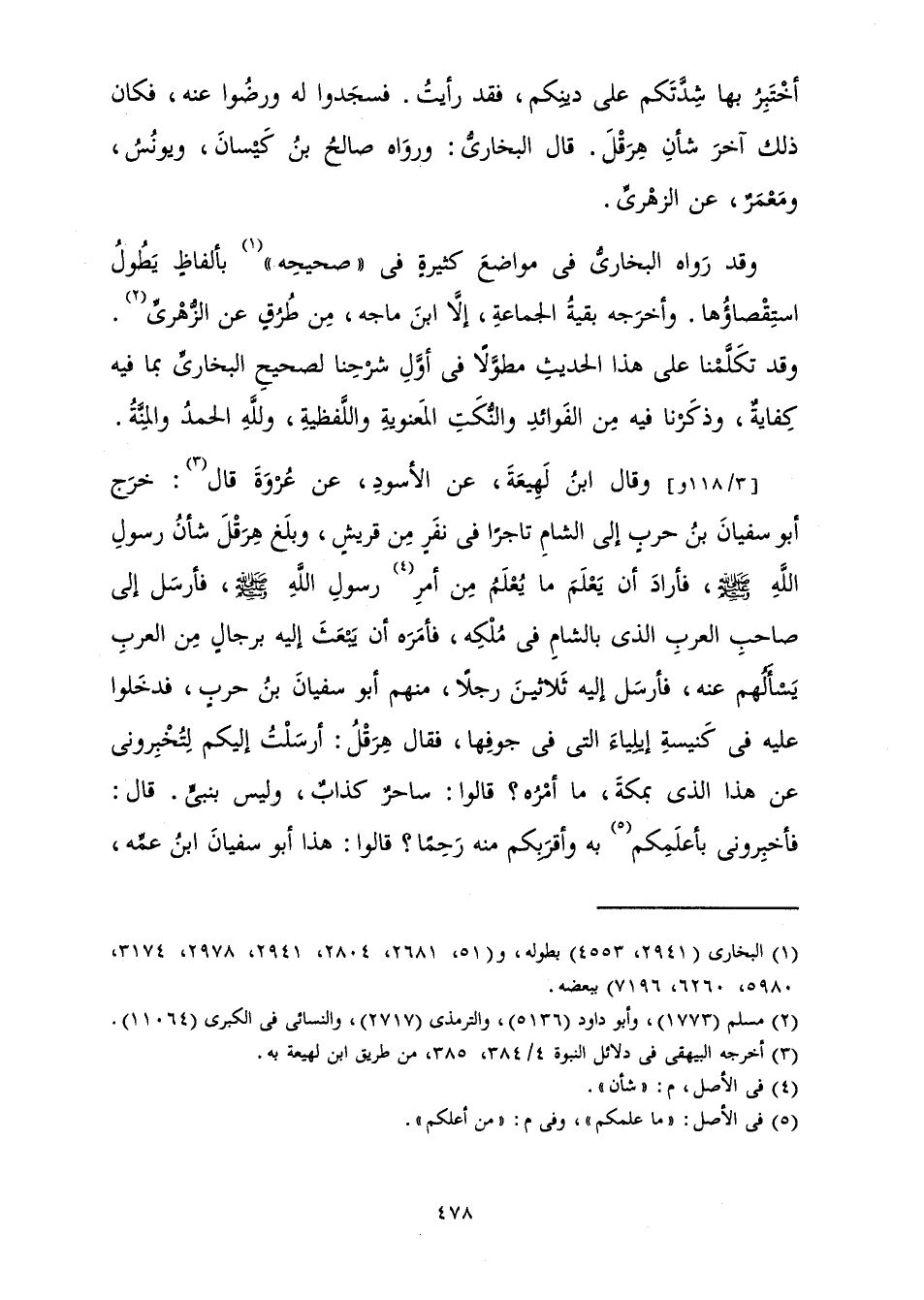 أَخْتَبِرُ بِهَا شِدَّتَكُمْ عَلَى دِينِكُمْ، فَقَدْ رَأَيْتُ. فَسَجَدُوا لَهُ وَرَضُوا عَنْهُ، فَكَانَ ذَلِكَ آخِرَ شَأْنِ هِرَقْلَ. قَالَ الْبُخَارِيُّ: وَرَوَاهُ صَالِحُ بْنُ كَيْسَانَ، وَيُونُسُ وَمَعْمَرٌ، عَنِ الزُّهْرِيِّ.