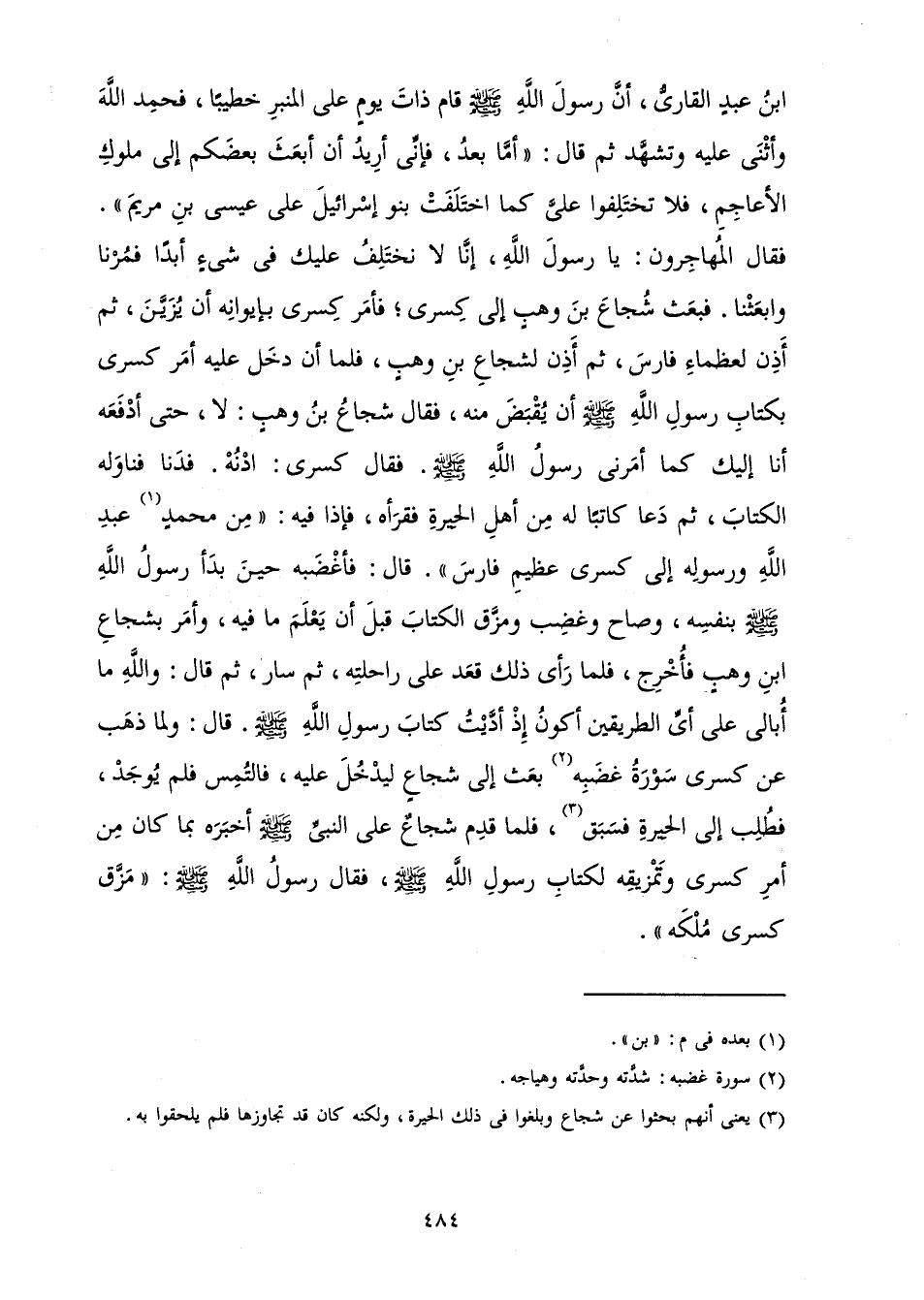 بْنُ عَبْدٍ الْقَارِيُّ، أَنَّ رَسُولَ اللَّهِ صَلَّى اللَّهُ عَلَيْهِ وَسَلَّمَ قَامَ ذَاتَ يَوْمٍ عَلَى الْمِنْبَرِ خَطِيبًا، فَحَمِدَ اللَّهَ وَأَثْنَى عَلَيْهِ وَتَشَهَّدَ ثُمَّ قَالَ: " أَمَّا بَعْدُ، فَإِنِّي أُرِيدُ أَنْ أَبْعَثَ بَعْضَكُمْ إِلَى مُلُوكِ الْأَعَاجِمِ، فَلَا تَخْتَلِفُوا عَلَيَّ كَمَا اخْتَلَفَتْ بَنُو إِسْرَائِيلَ عَلَى عِيسَى ابْنِ مَرْيَمَ ". فَقَالَ الْمُهَاجِرُونَ: يَا رَسُولَ اللَّهِ، إِنَّا لَا نَخْتَلِفُ عَلَيْكَ فِي شَيْءٍ أَبَدًا فَمُرْنَا وَابْعَثْنَا. فَبَعَثَ شُجَاعَ بْنَ وَهْبٍ إِلَى كِسْرَى، فَأَمَرَ كِسْرَى بِإِيوَانِهِ أَنْ يُزَيَّنَ، ثُمَّ أَذِنَ لِعُظَمَاءِ فَارِسَ ثُمَّ أَذِنَ لِشُجَاعِ بْنِ وَهْبٍ، فَلَمَّا أَنْ دَخَلَ عَلَيْهِ أَمَرَ كِسْرَى بِكِتَابِ رَسُولِ اللَّهِ صَلَّى اللَّهُ عَلَيْهِ وَسَلَّمَ أَنْ يُقْبَضَ مِنْهُ، فَقَالَ شُجَاعُ بْنُ وَهْبٍ: لَا، حَتَّى أَدْفَعَهُ أَنَا إِلَيْكَ كَمَا أَمَرَنِي رَسُولُ اللَّهِ صَلَّى اللَّهُ عَلَيْهِ وَسَلَّمَ فَقَالَ كِسْرَى: ادْنُهْ. فَدَنَا فَنَاوَلَهُ الْكِتَابَ، ثُمَّ دَعَا كَاتِبًا لَهُ مِنْ أَهْلِ الْحِيرَةِ فَقَرَأَهُ، فَإِذَا فِيهِ: " مِنْ مُحَمَّدٍ عَبْدِ اللَّهِ وَرَسُولِهِ إِلَى كِسْرَى عَظِيمِ فَارِسَ " قَالَ: فَأَغْضَبَهُ حِينَ بَدَأَ رَسُولُ اللَّهِ صَلَّى اللَّهُ عَلَيْهِ وَسَلَّمَ بِنَفْسِهِ، وَصَاحَ وَغَضِبَ وَمَزَّقَ الْكِتَابَ قَبْلَ أَنْ يَعْلَمَ مَا فِيهِ، وَأَمَرَ بِشُجَاعِ بْنِ وَهْبٍ فَأُخْرِجَ، فَلَمَّا رَأَى ذَلِكَ قَعَدَ عَلَى رَاحِلَتِهِ، ثُمَّ سَارَ، ثُمَّ قَالَ: وَاللَّهِ مَا أُبَالِي عَلَى أَيِّ الطَّرِيقَيْنِ أَكُونُ إِذْ أَدَّيْتُ كِتَابَ رَسُولِ اللَّهِ صَلَّى اللَّهُ عَلَيْهِ وَسَلَّمَ. قَالَ: وَلَمَّا ذَهَبَ عَنْ كِسْرَى سَوْرَةُ غَضَبِهِ بَعَثَ إِلَى شُجَاعٍ، لِيَدْخُلَ عَلَيْهِ، فَالْتُمِسَ فَلَمْ يُوجَدْ، فَطُلِبَ إِلَى الْحِيرَةِ فَسَبَقَ، فَلَمَّا قَدِمَ شُجَاعٌ عَلَى النَّبِيِّ صَلَّى اللَّهُ عَلَيْهِ وَسَلَّمَ أَخْبَرَهُ بِمَا كَانَ مِنْ أَمْرِ كِسْرَى وَتَمْزِيقِهِ لِكِتَابِ رَسُولِ اللَّهِ صَلَّى اللَّهُ عَلَيْهِ وَسَلَّمَ، فَقَالَ رَسُولُ اللَّهِ صَلَّى اللَّهُ عَلَيْهِ وَسَلَّمَ: " مَزَّقَ كِسْرَى مُلْكَهُ