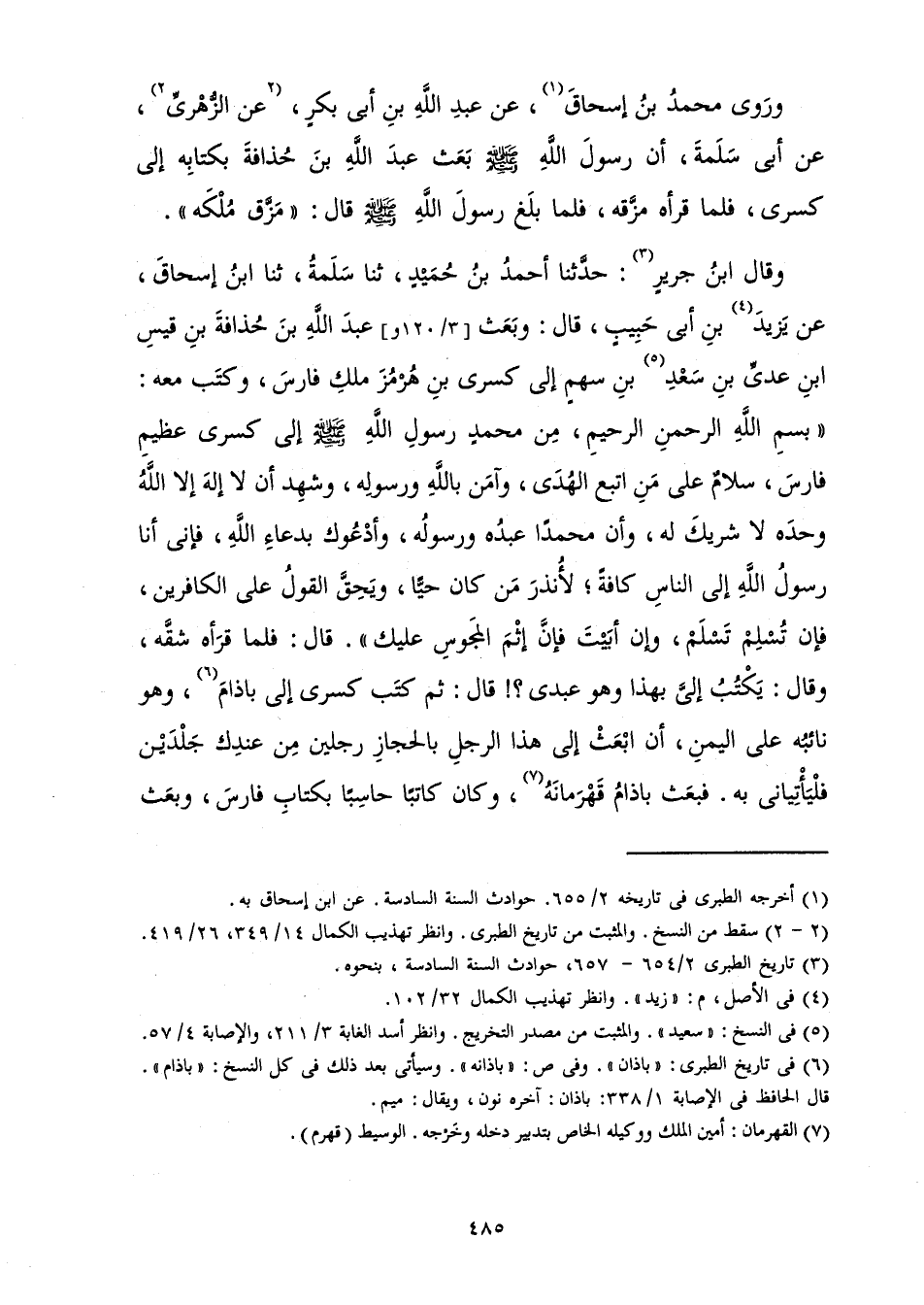 وَقَالَ ابْنُ جَرِيرٍ: حَدَّثَنَا أَحْمَدُ بْنُ حُمَيْدٍ، ثَنَا سَلَمَةُ، ثَنَا ابْنُ إِسْحَاقَ، عَنْ يَزِيدَ بْنِ أَبِي حَبِيبٍ، قَالَ: وَبَعَثَ عَبْدَ اللَّهِ بْنَ حُذَافَةَ بْنِ قَيْسِ بْنِ عَدِيِّ بْنِ سَعْدِ بْنِ سَهْمٍ إِلَى كِسْرَى بْنِ هُرْمُزَ مَلِكِ فَارِسَ وَكَتَبَ مَعَهُ: " «بِسْمِ اللَّهِ الرَّحْمَنِ الرَّحِيمِ، مِنْ مُحَمَّدٍ رَسُولِ اللَّهِ صَلَّى اللَّهُ عَلَيْهِ وَسَلَّمَ إِلَى كِسْرَى عَظِيمِ فَارِسَ، سَلَامٌ عَلَى مَنِ اتَّبَعَ الْهُدَى، وَآمَنَ بِاللَّهِ وَرَسُولِهِ، وَشَهِدَ أَنْ لَا إِلَهَ إِلَّا اللَّهُ وَحْدَهُ لَا شَرِيكَ لَهُ، وَأَنَّ مُحَمَّدًا عَبْدُهُ وَرَسُولُهُ، وَأَدْعُوكَ بِدُعَاءِ اللَّهِ، فَإِنِّي أَنَا رَسُولُ اللَّهِ إِلَى النَّاسِ كَافَّةً، لِأُنْذِرَ مَنْ كَانَ حَيًّا، وَيَحِقَّ الْقَوْلُ عَلَى الْكَافِرِينَ، فَإِنْ تُسْلِمْ تَسْلَمْ، وَإِنْ أَبَيْتَ فَإِنَّ إِثْمَ الْمَجُوسِ عَلَيْكَ» ". قَالَ: فَلَمَّا قَرَأَهُ شَقَّهُ، وَقَالَ: يَكْتُبُ إِلَيَّ بِهَذَا وَهُوَ عَبْدِي؟! قَالَ: ثُمَّ كَتَبَ كِسْرَى إِلَى بَاذَامَ، وَهُوَ نَائِبُهُ عَلَى الْيَمَنِ، أَنِ ابْعَثْ إِلَى هَذَا الرَّجُلِ بِالْحِجَازِ رَجُلَيْنِ مِنْ عِنْدِكَ جَلْدَيْنِ فَلْيَأْتِيَانِي بِهِ. فَبَعَثَ بَاذَامُ قَهْرَمَانَهُ، وَكَانَ كَاتِبًا حَاسِبًا بِكِتَابِ فَارِسَ، وَبَعَثَ