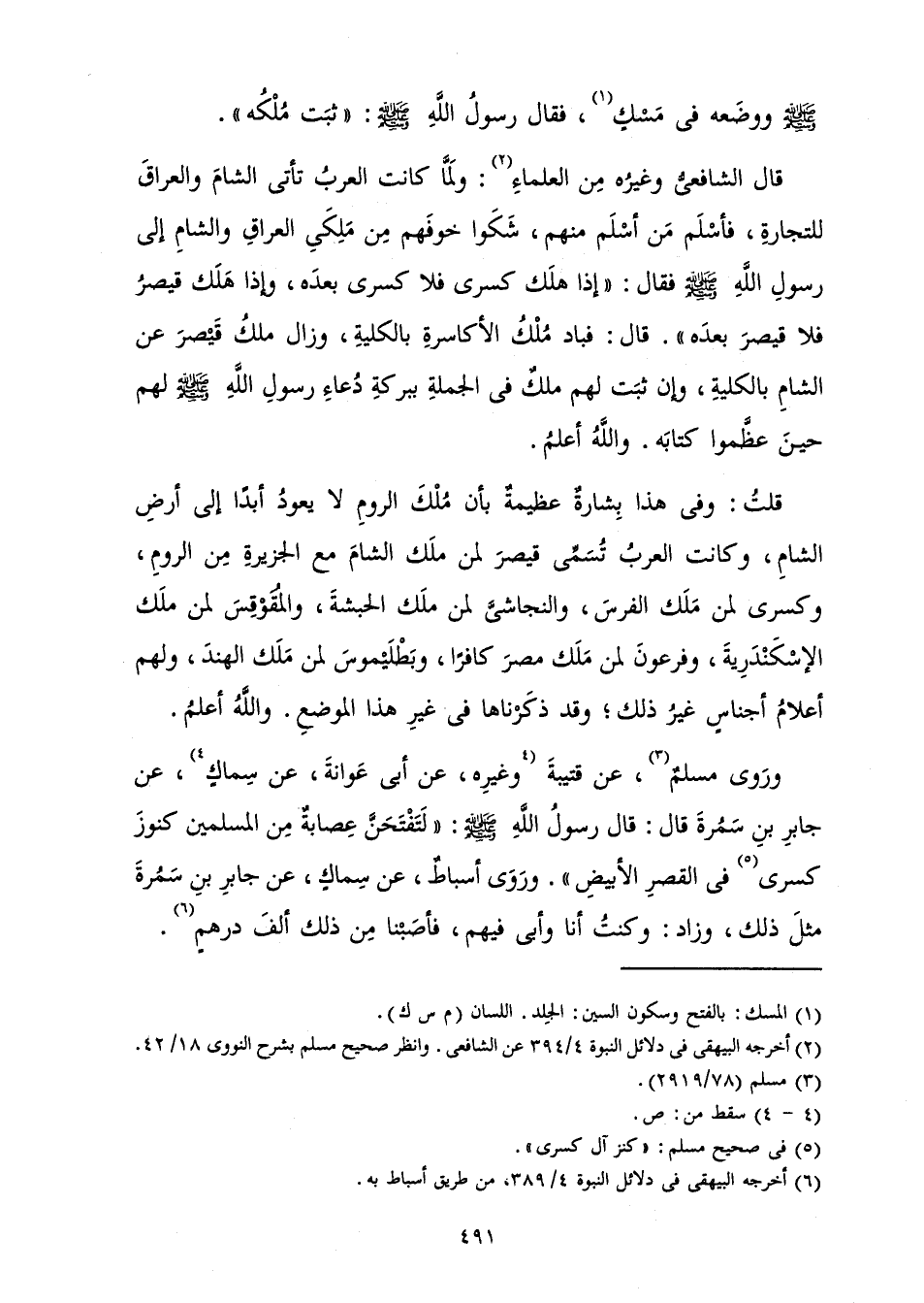قَالَ الشَّافِعِيُّ وَغَيْرُهُ مِنَ الْعُلَمَاءِ: «وَلَمَّا كَانَتِ الْعَرَبُ تَأْتِي الشَّامَ وَالْعِرَاقَ لِلتِّجَارَةِ، فَأَسْلَمَ مَنْ أَسْلَمَ مِنْهُمْ، شَكَوْا خَوْفَهُمْ مِنْ مَلِكَيِ الْعِرَاقِ وَالشَّامِ إِلَى رَسُولِ اللَّهِ صَلَّى اللَّهُ عَلَيْهِ وَسَلَّمَ فَقَالَ: " إِذَا هَلَكَ كِسْرَى فَلَا كِسْرَى بَعْدَهُ، وَإِذَا هَلَكَ قَيْصَرُ فَلَا قَيْصَرَ بَعْدَهُ» قَالَ: فَبَادَ مُلْكُ الْأَكَاسِرَةِ بِالْكُلِّيَّةِ، وَزَالَ مُلْكُ قَيْصَرَ عَنِ الشَّامِ بِالْكُلِّيَّةِ، وَإِنْ ثَبَتَ لَهُمْ مُلْكٌ فِي الْجُمْلَةِ بِبَرَكَةِ دُعَاءِ رَسُولِ اللَّهِ صَلَّى اللَّهُ عَلَيْهِ وَسَلَّمَ لَهُمْ حِينَ عَظَّمُوا كِتَابَهُ وَاللَّهُ أَعْلَمُ.