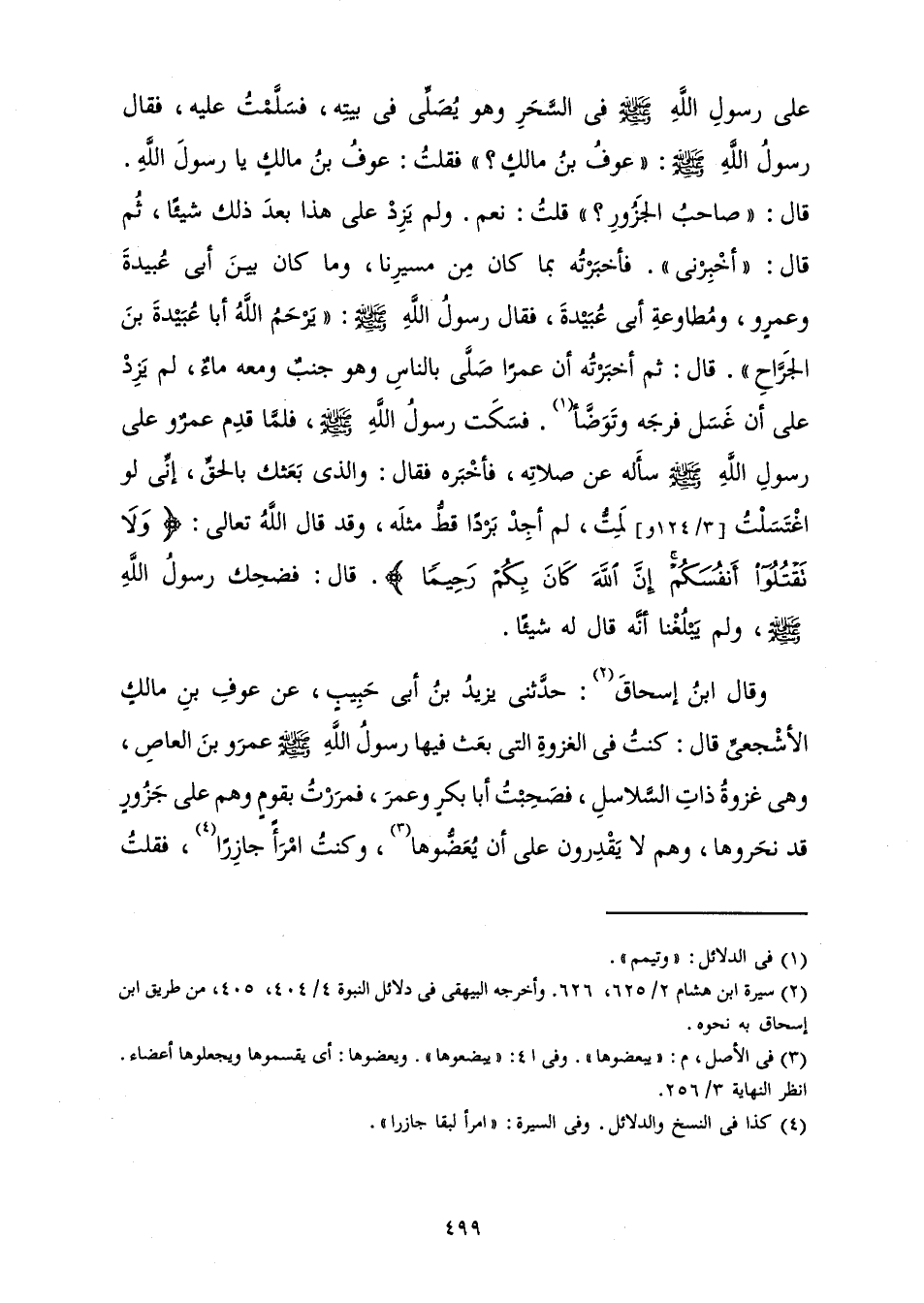 عَلَى رَسُولِ اللَّهِ صَلَّى اللَّهُ عَلَيْهِ وَسَلَّمَ فِي السَّحَرِ وَهُوَ يُصَلِّي فِي بَيْتِهِ، فَسَلَّمْتُ عَلَيْهِ، فَقَالَ رَسُولُ اللَّهِ صَلَّى اللَّهُ عَلَيْهِ وَسَلَّمَ: " عَوْفُ بْنُ مَالِكٍ؟ " فَقُلْتُ: عَوْفُ بْنُ مَالِكٍ يَا رَسُولَ اللَّهِ. قَالَ: " صَاحِبُ الْجَزُورِ؟ " قُلْتُ: نَعَمْ. وَلَمْ يَزِدْ عَلَى هَذَا بَعْدَ ذَلِكَ شَيْئًا، ثُمَّ قَالَ: " أَخْبِرْنِي ". فَأَخْبَرْتُهُ بِمَا كَانَ مِنْ مَسِيرِنَا، وَمَا كَانَ مِنْ أَبِي عُبَيْدَةَ وَعَمْرٍو، وَمُطَاوَعَةُ أَبِي عُبَيْدَةَ، فَقَالَ رَسُولُ اللَّهِ صَلَّى اللَّهُ عَلَيْهِ وَسَلَّمَ: " يَرْحَمُ اللَّهُ أَبَا عُبَيْدَةَ بْنَ الْجَرَّاحِ ". قَالَ: ثُمَّ أَخْبَرْتُهُ أَنَّ عَمْرًا صَلَّى بِالنَّاسِ وَهُوَ جُنُبٌ وَمَعَهُ مَاءٌ، لَمْ يَزِدْ عَلَى أَنْ غَسَلَ فَرْجَهُ وَتَوَضَّأَ، فَسَكَتَ رَسُولُ اللَّهِ صَلَّى اللَّهُ عَلَيْهِ وَسَلَّمَ، فَلَمَّا قَدِمَ عَمْرٌو عَلَى رَسُولِ اللَّهِ صَلَّى اللَّهُ عَلَيْهِ وَسَلَّمَ سَأَلَهُ عَنْ صَلَاتِهِ، فَأَخْبَرَهُ فَقَالَ: وَالَّذِي بَعَثَكَ بِالْحَقِّ، إِنِّي لَوِ اغْتَسَلْتُ لَمِتُّ، وَلَمْ أَجِدْ بَرْدًا قَطُّ مِثْلَهُ، وَقَدْ قَالَ تَعَالَى: {وَلَا تَقْتُلُوا أَنْفُسَكُمْ إِنَّ اللَّهَ كَانَ بِكُمْ رَحِيمًا} [النساء: 29] قَالَ: فَضَحِكَ رَسُولُ اللَّهِ صَلَّى اللَّهُ عَلَيْهِ وَسَلَّمَ، وَلَمْ يَبْلُغْنَا أَنَّهُ قَالَ شَيْئًا» .