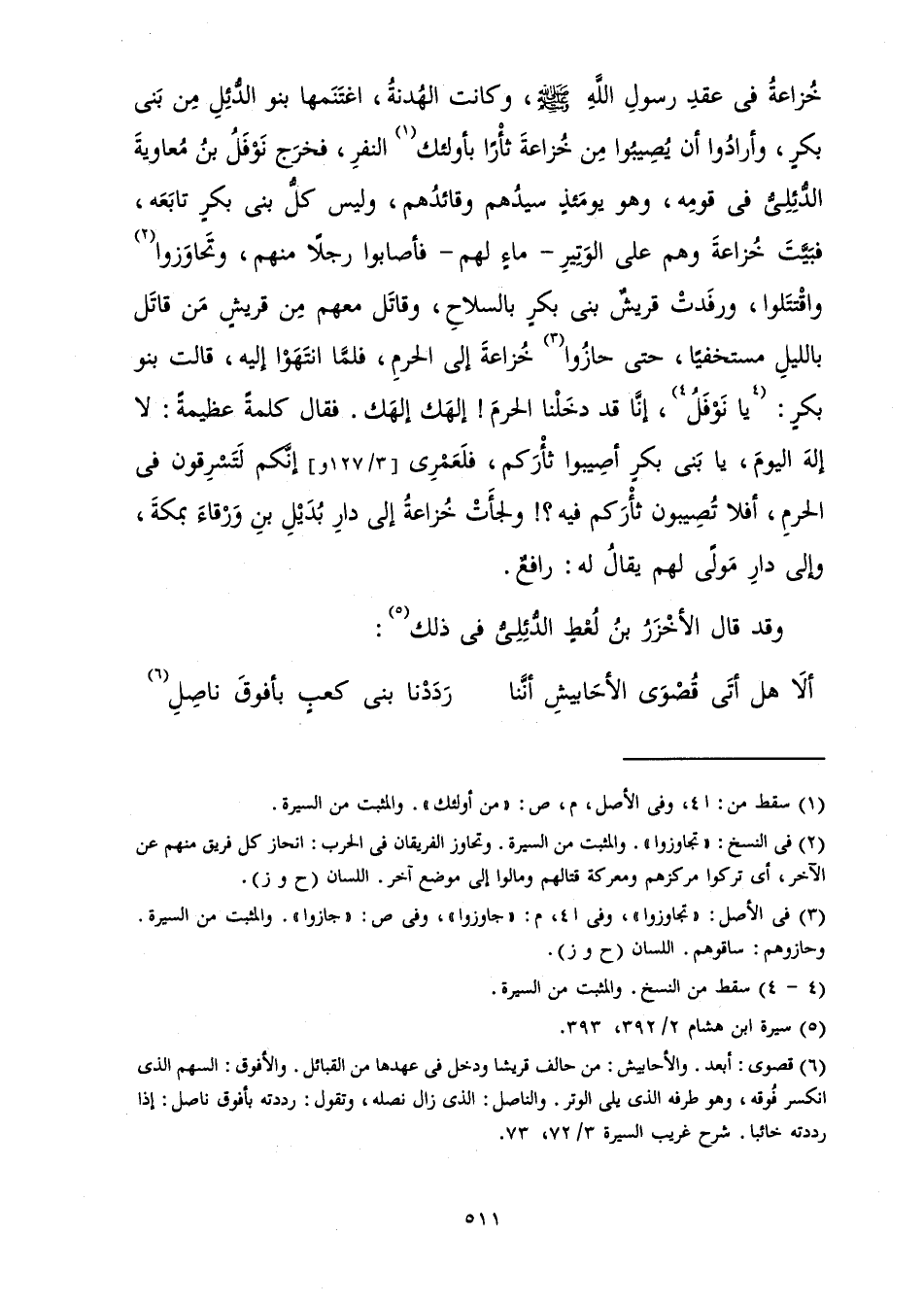خُزَاعَةُ فِي عَقْدِ رَسُولِ اللَّهِ صَلَّى اللَّهُ عَلَيْهِ وَسَلَّمَ، وَكَانَتِ الْهُدْنَةُ، اغْتَنَمَهَا بَنُو الدُّئِلِ مِنْ بَنِي بَكْرٍ، وَأَرَادُوا أَنْ يُصِيبُوا مِنْ خُزَاعَةَ ثَأْرًا بِأُولَئِكَ النَّفَرِ، فَخَرَجَ نَوْفَلُ بْنُ مُعَاوِيَةَ الدُّئِلِيُّ فِي قَوْمِهِ، وَهُوَ يَوْمَئِذٍ سَيِّدُهُمْ وَقَائِدُهُمْ، وَلَيْسَ كُلُّ بَنِي بَكْرٍ تَابَعَهُ، فَبَيَّتَ خُزَاعَةَ وَهُمْ عَلَى الْوَتِيرِ - مَاءٍ لَهُمْ - فَأَصَابُوا رَجُلًا مِنْهُمْ، وَتَحَاوَزُوا، وَاقْتَتَلُوا، وَرَفَدَتْ قُرَيْشٌ بَنِي بَكْرٍ بِالسِّلَاحِ، وَقَاتَلَ مَعَهُمْ مِنْ قُرَيْشٍ مَنْ قَاتَلَ بِاللَّيْلِ مُسْتَخْفِيًا، حَتَّى حَازُوا خُزَاعَةَ إِلَى الْحَرَمِ، فَلَمَّا انْتَهَوْا إِلَيْهِ، قَالَتْ بَنُو بَكْرٍ: يَا نَوْفَلُ، إِنَّا قَدْ دَخَلْنَا الْحَرَمَ! إِلَهَكَ إِلَهَكَ. فَقَالَ كَلِمَةً عَظِيمَةً: لَا إِلَهَ الْيَوْمَ، يَا بَنِي بَكْرٍ أَصِيبُوا ثَأْرَكُمْ، فَلَعَمْرِي إِنَّكُمْ لَتَسْرِقُونِ فِي الْحَرَمِ، أَفَلَا تُصِيبُونَ ثَأْرَكُمْ فِيهِ؟! وَلَجَأَتْ خُزَاعَةُ إِلَى دَارِ بُدَيْلِ بْنِ وَرْقَاءَ بِمَكَّةَ، وَإِلَى دَارِ مَوْلًى لَهُمْ يُقَالُ لَهُ: رَافِعٌ.
