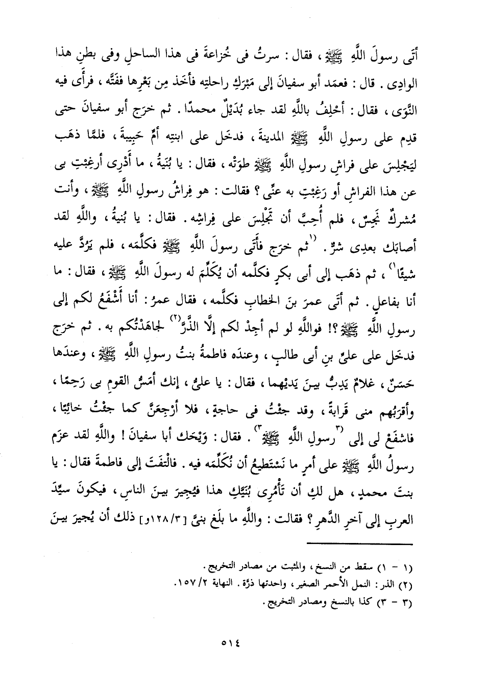 أَتَى رَسُولَ اللَّهِ صَلَّى اللَّهُ عَلَيْهِ وَسَلَّمَ، فَقَالَ: سِرْتُ فِي خُزَاعَةَ فِي هَذَا السَّاحِلِ وَفِي بَطْنِ هَذَا الْوَادِي. قَالَ: فَعَمَدَ أَبُو سُفْيَانَ إِلَى مَبْرَكِ رَاحِلَتِهِ فَأَخَذَ مِنْ بَعْرِهَا فَفَتَّهُ، فَرَأَى فِيهِ النَّوَى، فَقَالَ: أَحْلِفُ بِاللَّهِ لَقَدْ جَاءَ بُدَيْلٌ مُحَمَّدًا. ثُمَّ خَرَجَ أَبُو سُفْيَانَ حَتَّى قَدِمَ عَلَى رَسُولِ اللَّهِ صَلَّى اللَّهُ عَلَيْهِ وَسَلَّمَ الْمَدِينَةَ، فَدَخَلَ عَلَى ابْنَتِهِ أُمِّ حَبِيبَةَ، فَلَمَّا ذَهَبَ لِيَجْلِسَ عَلَى فِرَاشِ رَسُولِ اللَّهِ صَلَّى اللَّهُ عَلَيْهِ وَسَلَّمَ طَوَتْهُ، فَقَالَ: يَا بُنَيَّةُ، مَا أَدْرِي أَرَغِبْتِ بِي عَنْ هَذَا الْفِرَاشِ أَوْ رَغِبْتِ بِهِ عَنِّي؟ فَقَالَتْ: هُوَ فِرَاشُ رَسُولِ اللَّهِ صَلَّى اللَّهُ عَلَيْهِ وَسَلَّمَ، وَأَنْتَ مُشْرِكٌ نَجِسٌ، فَلَمْ أُحِبَّ أَنْ تَجْلِسَ عَلَى فِرَاشِهِ. فَقَالَ: يَا بُنَيَّةُ، وَاللَّهِ لَقَدْ أَصَابَكِ بَعْدِي شَرٌّ. ثُمَّ خَرَجَ فَأَتَى رَسُولَ اللَّهِ صَلَّى اللَّهُ عَلَيْهِ وَسَلَّمَ فَكَلَّمَهُ، فَلَمْ يَرُدَّ عَلَيْهِ شَيْئًا، ثُمَّ ذَهَبَ إِلَى أَبِي بَكْرٍ فَكَلَّمَهُ أَنْ يُكَلِّمَ لَهُ رَسُولَ اللَّهِ صَلَّى اللَّهُ عَلَيْهِ وَسَلَّمَ، فَقَالَ: مَا أَنَا بِفَاعِلٍ. ثُمَّ أَتَى عُمَرَ بْنَ الْخَطَّابِ فَكَلَّمَهُ، فَقَالَ عُمَرُ: أَنَا أَشْفَعُ لَكُمْ إِلَى رَسُولِ اللَّهِ صَلَّى اللَّهُ عَلَيْهِ وَسَلَّمَ؟! فَوَاللَّهِ لَوْ لَمْ أَجِدْ لَكُمْ إِلَّا الذَّرَّ لَجَاهَدْتُكُمْ بِهِ. ثُمَّ خَرَجَ فَدَخَلَ عَلَى عَلِيِّ بْنِ أَبِي طَالِبٍ، وَعِنْدَهُ فَاطِمَةُ بِنْتُ رَسُولِ اللَّهِ صَلَّى اللَّهُ عَلَيْهِ وَسَلَّمَ، وَعِنْدَهَا حَسَنٌ، غُلَامٌ يَدِبُّ بَيْنَ يَدَيْهِمَا، فَقَالَ: يَا عَلِيُّ، إِنَّكَ أَمَسَّ الْقَوْمِ بِي رَحِمًا، وَأَقْرَبَهُمْ مِنِّي قَرَابَةً، وَقَدْ جِئْتُ فِي حَاجَةٍ، فَلَا أَرْجِعَنَّ كَمَا جِئْتُ خَائِبًا، فَاشْفَعْ لِي إِلَى رَسُولِ اللَّهِ صَلَّى اللَّهُ عَلَيْهِ وَسَلَّمَ. فَقَالَ: وَيْحَكَ أَبَا سُفْيَانَ! وَاللَّهِ لَقَدْ عَزَمَ رَسُولُ اللَّهِ صَلَّى اللَّهُ عَلَيْهِ وَسَلَّمَ عَلَى أَمْرٍ مَا نَسْتَطِيعُ أَنْ نُكَلِّمَهُ فِيهِ. فَالْتَفَتَ إِلَى فَاطِمَةَ فَقَالَ: يَا بِنْتَ مُحَمَّدٍ، هَلْ لَكِ أَنْ تَأْمُرِي بُنَيَّكِ هَذَا فَيُجِيرُ بَيْنَ النَّاسِ، فَيَكُونُ سَيِّدَ الْعَرَبِ إِلَى آخِرِ الدَّهْرِ؟ فَقَالَتْ: وَاللَّهِ مَا بَلَغَ بُنَيَّ ذَلِكَ أَنْ يُجِيرَ بَيْنَ