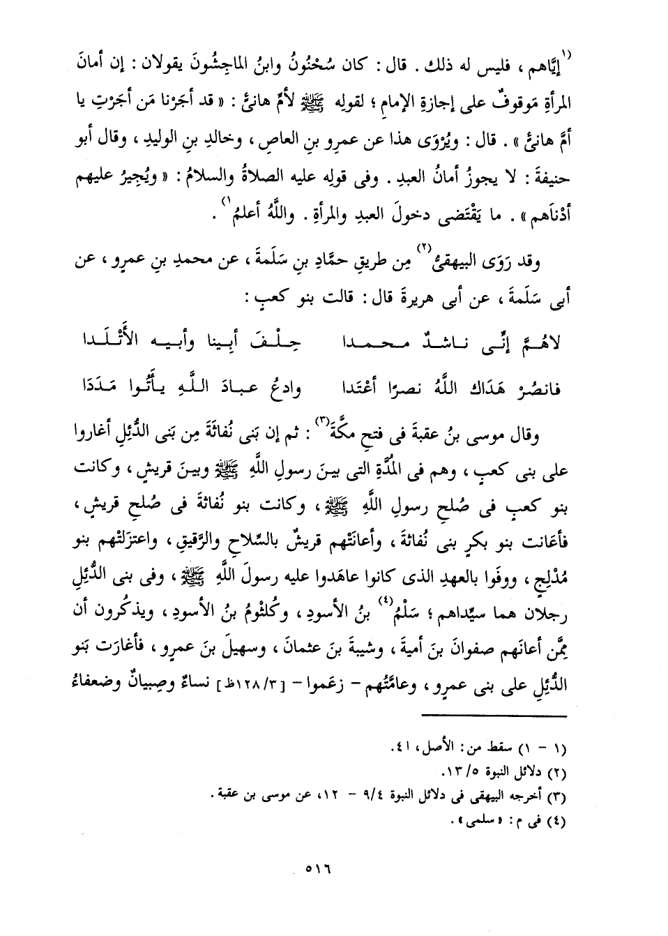 وَقَالَ مُوسَى بْنُ عُقْبَةَ فِي فَتْحِ مَكَّةَ: ثُمَّ إِنَّ بَنِي نُفَاثَةَ مِنْ بَنِي الدُّئِلِ أَغَارُوا عَلَى بَنِي كَعْبٍ، وَهُمْ فِي الْمُدَّةِ الَّتِي بَيْنَ رَسُولِ اللَّهِ صَلَّى اللَّهُ عَلَيْهِ وَسَلَّمَ وَبَيْنَ قُرَيْشٍ، وَكَانَتْ بَنُو كَعْبٍ فِي صُلْحِ رَسُولِ اللَّهِ صَلَّى اللَّهُ عَلَيْهِ وَسَلَّمَ، وَكَانَتْ بَنُو نُفَاثَةَ فِي صُلْحِ قُرَيْشٍ، فَأَعَانَتْ بَنُو بَكْرٍ بَنِي نُفَاثَةَ، وَأَعَانَتْهُمْ قُرَيْشٌ بِالسِّلَاحِ وَالرَّقِيقِ، وَاعْتَزَلَتْهُمْ بَنُو مُدْلِجٍ، وَوَفَوْا بِالْعَهْدِ الَّذِي كَانُوا عَاهَدُوا عَلَيْهِ رَسُولَ اللَّهِ صَلَّى اللَّهُ عَلَيْهِ وَسَلَّمَ، وَفِي بَنِي الدُّئِلِ رَجُلَانِ هُمَا سَيِّدَاهُمْ، سَلْمُ بْنُ الْأَسْوَدِ، وَكُلْثُومُ بْنُ الْأَسْوَدِ، وَيَذْكُرُونَ أَنَّ مِمَّنْ أَعَانَهُمْ صَفْوَانَ بْنَ أُمَيَّةَ، وَشَيْبَةَ بْنَ عُثْمَانَ، وَسُهَيْلَ بْنَ عَمْرٍو، فَأَغَارَتْ بَنُو الدُّئِلِ عَلَى بَنِي عَمْرٍو، وَعَامَّتُهُمْ - زَعَمُوا - نِسَاءٌ وَصِبْيَانٌ وَضُعَفَاءُ