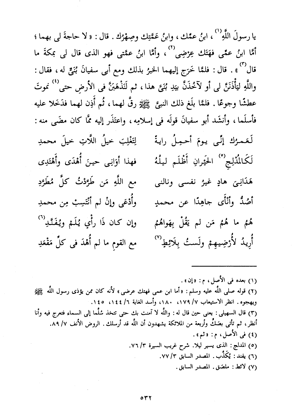 يَا رَسُولَ اللَّهِ، ابْنُ عَمِّكَ، وَابْنُ عَمَّتِكَ، وَصِهْرُكَ. قَالَ: لَا حَاجَةَ لِي بِهِمَا، أَمَّا ابْنُ عَمِّي فَهَتَكَ عِرْضِي، وَأَمَّا ابْنُ عَمَّتِي فَهُوَ الَّذِي قَالَ لِي بِمَكَّةَ مَا قَالَ. قَالَ: فَلَمَّا خَرَجَ إِلَيْهِمَا الْخَبَرُ بِذَلِكَ وَمَعَ أَبِي سُفْيَانَ بُنَيٌّ لَهُ، فَقَالَ: وَاللَّهِ لَيَأْذَنَنَّ لِي أَوْ لَآخُذَنَّ بِيَدِ بُنَيَّ هَذَا، ثُمَّ لَنَذْهَبَنَّ فِي الْأَرْضِ حَتَّى نَمُوتَ عَطَشًا وَجُوعًا. فَلَمَّا بَلَغَ ذَلِكَ النَّبِيَّ صَلَّى اللَّهُ عَلَيْهِ وَسَلَّمَ رَقَّ لَهُمَا، ثُمَّ أَذِنَ لَهُمَا فَدَخَلَا عَلَيْهِ فَأَسْلَمَا، وَأَنْشَدَ أَبُو سُفْيَانَ قَوْلَهُ فِي إِسْلَامِهِ، وَاعْتَذَرَ إِلَيْهِ مِمَّا كَانَ مَضَى مِنْهُ: