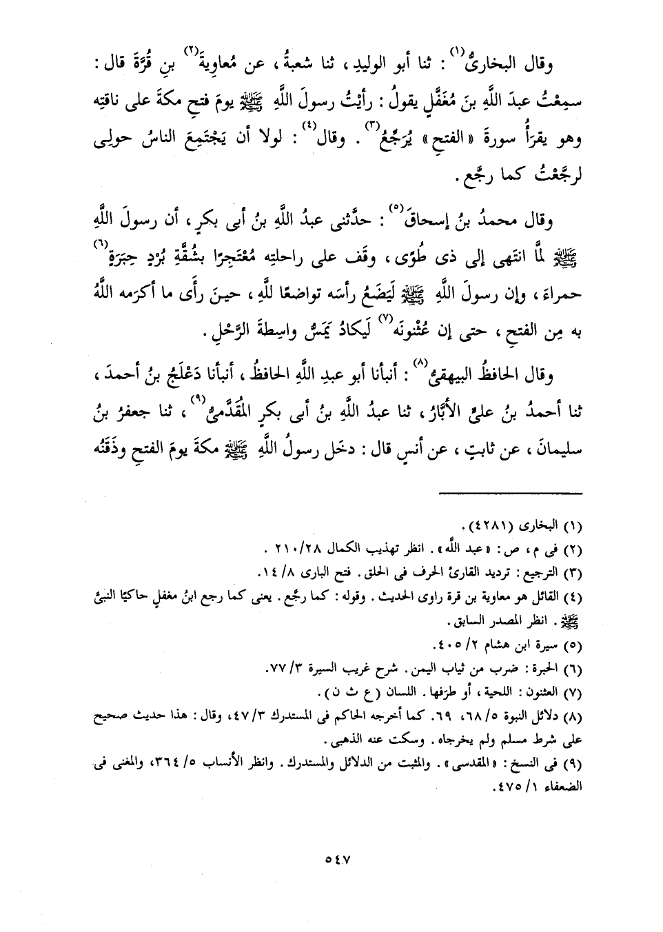 وَقَالَ الْبُخَارِيُّ: ثَنَا أَبُو الْوَلِيدِ، ثَنَا شُعْبَةُ، عَنْ مُعَاوِيَةَ بْنِ قُرَّةَ قَالَ: «سَمِعْتُ عَبْدَ اللَّهِ بْنَ مُغَفَّلٍ يَقُولُ: رَأَيْتُ رَسُولَ اللَّهِ صَلَّى اللَّهُ عَلَيْهِ وَسَلَّمَ يَوْمَ فَتْحِ مَكَّةَ عَلَى نَاقَتِهِ وَهُوَ يَقْرَأُ سُورَةَ " الْفَتْحِ " يُرَجِّعُ. وَقَالَ: لَوْلَا أَنْ يَجْتَمِعَ النَّاسُ حَوْلِي لَرَجَّعْتُ كَمَا رَجَّعَ» .