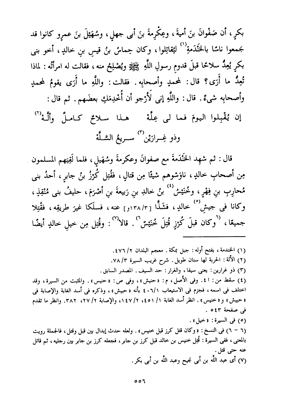 قَالَ: ثُمَّ شَهِدَ الْخَنْدَمَةَ مَعَ صَفْوَانَ وَعِكْرِمَةَ وَسُهَيْلٍ، فَلَمَّا لَقِيَهُمُ الْمُسْلِمُونَ مِنْ أَصْحَابِ خَالِدٍ، نَاوَشُوهُمْ شَيْئًا مِنْ قِتَالِ، فَقُتِلَ كُرْزُ بْنُ جَابِرٍ، أَحَدُ بَنِي مُحَارِبِ بْنِ فِهْرٍ، وَخُنَيْسُ بْنُ خَالِدِ بْنِ رَبِيعَةَ بْنِ أَصْرَمَ، حَلِيفُ بَنِي مُنْقِذٍ، وَكَانَا فِي جَيْشِ خَالِدٍ فَشَذَّا عَنْهُ، فَسَلَكَا غَيْرَ طَرِيقِهِ، فَقُتِلَا جَمِيعًا، وَكَانَ قَبْلَ كُرْزٍ قُتِلَ خُنَيْسٌ. قَالَا: وَقُتِلَ مِنْ خَيْلِ خَالِدٍ أَيْضًا