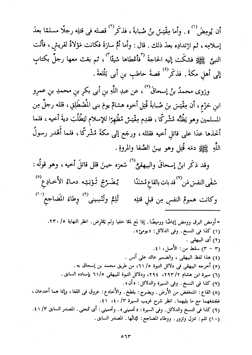 أَنْ يُومِضَ» ". وَأَمَّا مِقْيَسُ بْنُ صَبَابَةَ فَذَكَرَ قِصَّتَهُ فِي قَتْلِهِ رَجُلًا مُسْلِمًا بَعْدَ إِسْلَامِهِ، ثُمَّ ارْتِدَادِهِ بَعْدَ ذَلِكَ. قَالَ: وَأَمَّا «أُمُّ سَارَةَ فَكَانَتْ مَوْلَاةً، لِقُرَيْشٍ، فَأَتَتِ النَّبِيَّ صَلَّى اللَّهُ عَلَيْهِ وَسَلَّمَ فَشَكَتْ إِلَيْهِ الْحَاجَةَ، فَأَعْطَاهَا شَيْئًا، ثُمَّ بَعَثَ مَعَهَا رَجُلٌ بِكِتَابٍ إِلَى أَهْلِ مَكَّةَ.» فَذَكَرَ قِصَّةَ حَاطِبِ بْنِ أَبِي بَلْتَعَةَ.