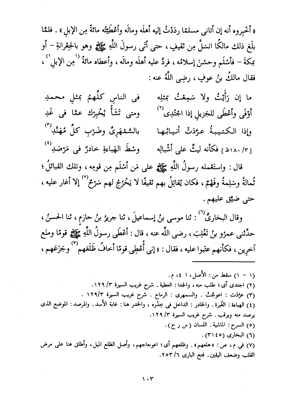 " أَخْبِرُوهُ أَنَّهُ إِنْ أَتَانِي مُسْلِمًا رَدَدْتُ إِلَيْهِ أَهْلَهُ وَمَالَهُ وَأَعْطَيْتُهُ مِائَةً مِنَ الْإِبِلِ ". فَلَمَّا بَلَغَ ذَلِكَ مَالِكًا انْسَلَّ مِنْ ثَقِيفٍ، حَتَّى أَتَى رَسُولَ اللَّهِ صَلَّى اللَّهُ عَلَيْهِ وَسَلَّمَ وَهُوَ بِالْجَعْرَانَةِ - أَوْ بِمَكَّةَ - فَأَسْلَمَ وَحَسُنَ إِسْلَامُهُ، فَرَدَّ عَلَيْهِ أَهْلَهُ وَمَالَهُ، وَأَعْطَاهُ مِائَةً مِنَ الْإِبِلِ، فَقَالَ مَالِكُ بْنُ عَوْفٍ رَضِيَ اللَّهُ عَنْهُ: