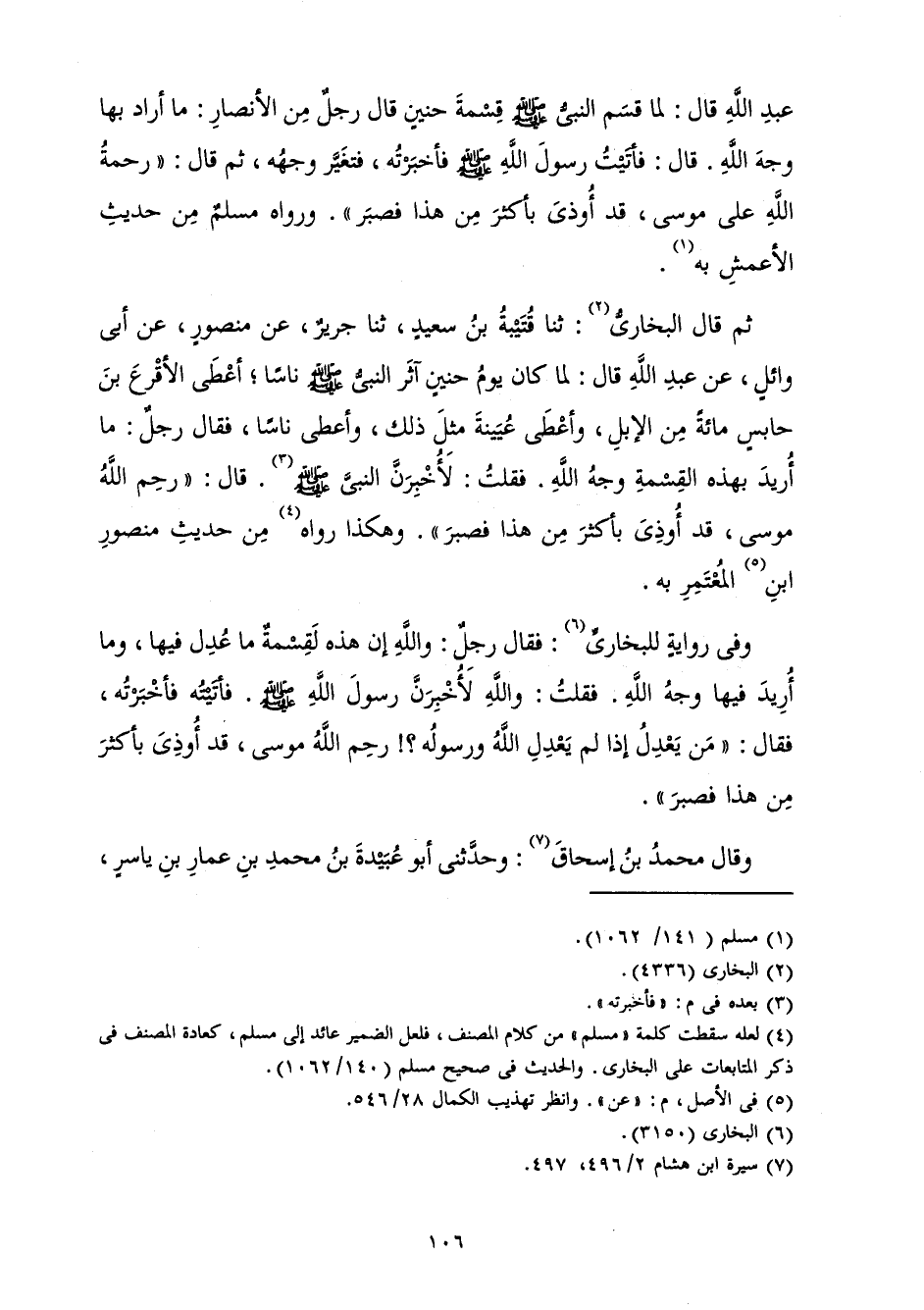 عَبْدِ اللَّهِ قَالَ: «لَمَّا قَسَّمَ النَّبِيُّ صَلَّى اللَّهُ عَلَيْهِ وَسَلَّمَ قِسْمَةَ حُنَيْنٍ قَالَ رَجُلٌ مِنَ الْأَنْصَارِ: مَا أَرَادَ بِهَا وَجْهَ اللَّهِ. قَالَ: فَأَتَيْتُ رَسُولَ اللَّهِ صَلَّى اللَّهُ عَلَيْهِ وَسَلَّمَ فَأَخْبَرْتُهُ، فَتَغَيَّرَ وَجْهُهُ، ثُمَّ قَالَ: " رَحْمَةُ اللَّهِ عَلَى مُوسَى، قَدْ أُوذِيَ بِأَكْثَرَ مِنْ هَذَا فَصَبَرَ» وَرَوَاهُ مُسْلِمٌ مِنْ حَدِيثِ الْأَعْمَشِ بِهِ.